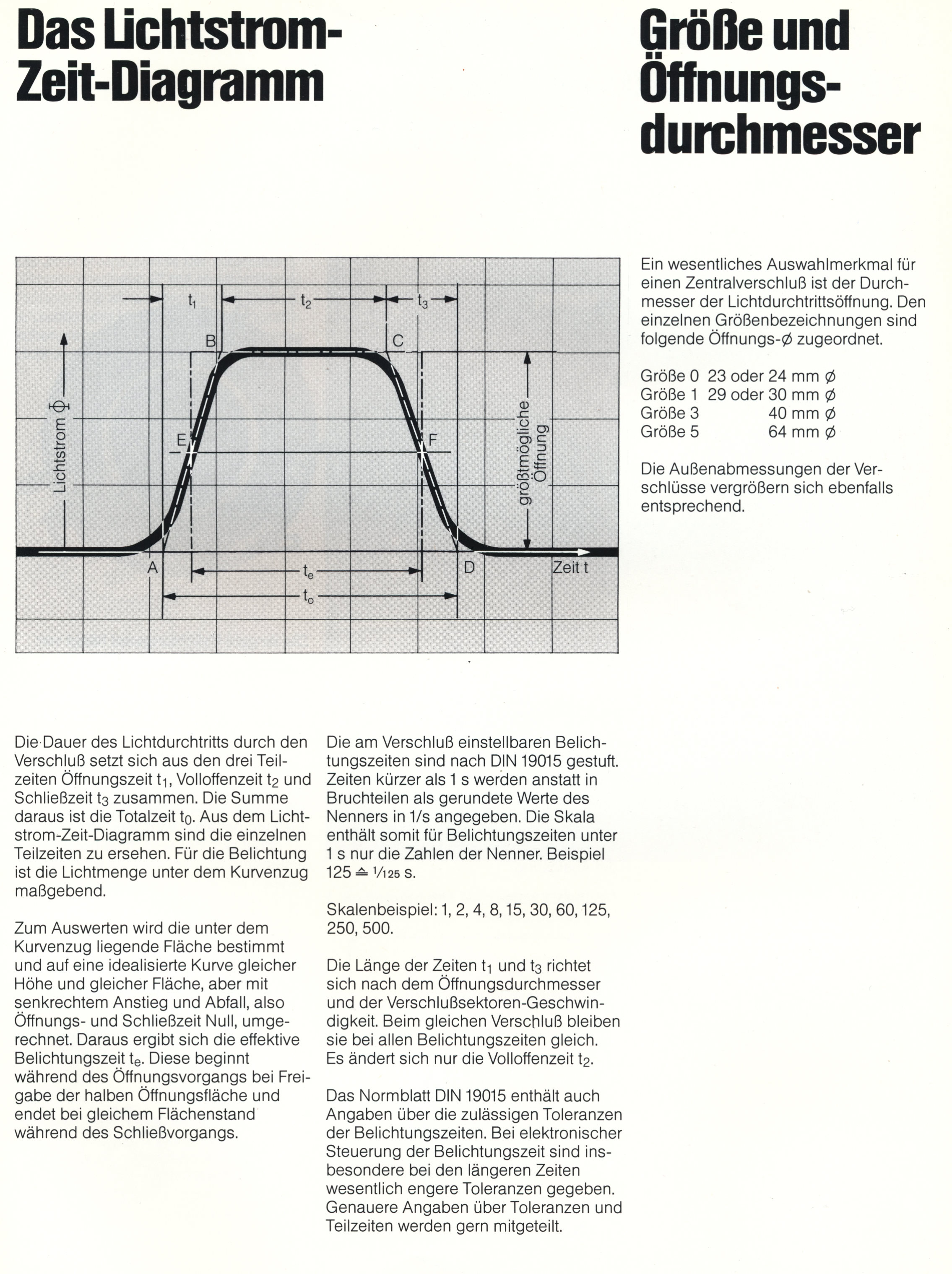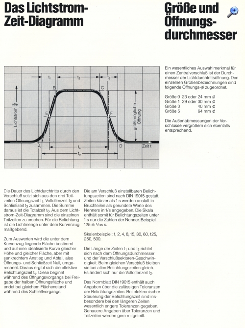Aus einem Prospekt der Firma Prontor aus den 1980er Jahren habe ich die nachfolgende Seite gefunden in der das "Lichtstrom-Zeit Diagramm" für Zentralverschlüsse anschaulich erklärt wird. Wie bei allem in Deutschland gibt es auch hier eine Industrienorm.
