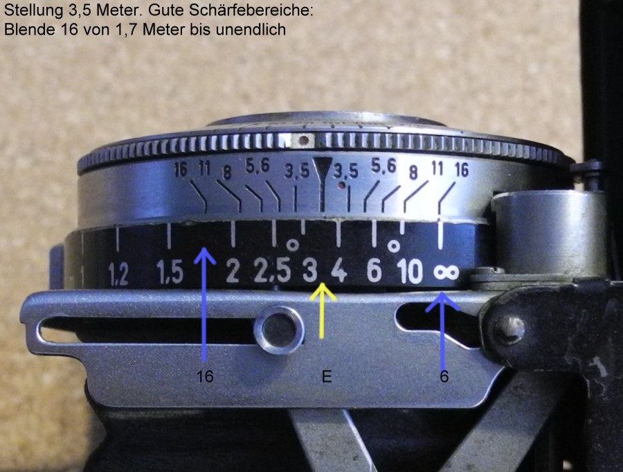 nochmals das Thema Tiefenschärfe (Schärfentiefe): Bei einigen Kameras gab es auf der Entfernungseinstellskala neben den Meter-Ziffern eine oder zwei Marken. Damit wurde auf Entfernungen verwiesen, bei der das Objektiv eine besonders große Tiefenschärfe aufwies. Das war für damalige Photographen durchaus wichtig, weil Kameras ohne Abblendung nur bedingt Informationen über den Schärfentiefebereich lieferten.