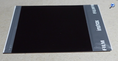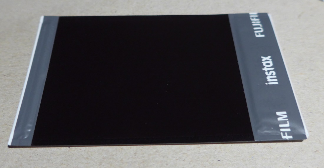 Mit einem Schwarz-Weiss Instax mini Pak hatte ich ein Bild in volliger Dunkelheit in die Agfa Clack Box eingelegt. Passt gut. Aufnahme gemacht, in Dunkelheit entnommen, und mit einer Rolle die Chemie gleichmässig verteilt.