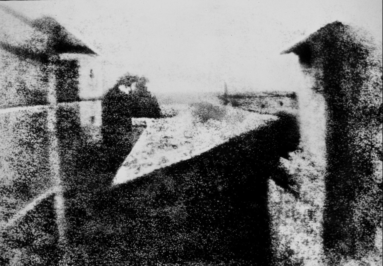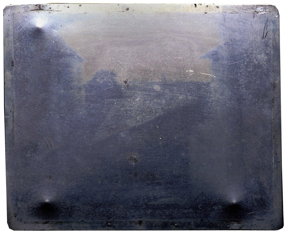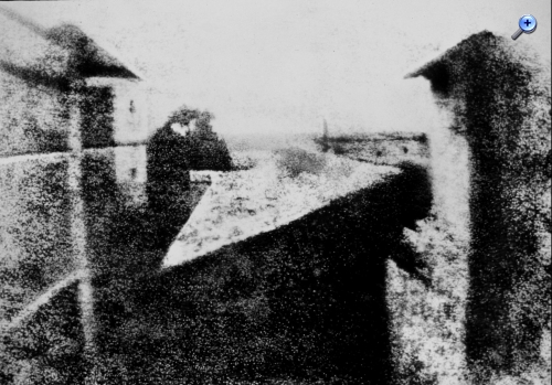 Bildquelle: Wikipedia Beschreibung in Wikipedia: Blick aus dem Arbeitszimmer von Le Gras (französischer Titel La cour du domaine du Gras „Der Hof des Gutshofes von Le Gras“ oder Point de vue du Gras „Ansicht von Le Gras“) ist die erste erfolgreich aufgenommene und erhaltene Fotografie der Welt. Sie wurde 1826 von Joseph Nicéphore Niépce im französischen Saint-Loup-de-Varennes hergestellt. Das Foto zeigt den Blick aus dem Arbeitszimmer von Niépces Gutshof Le Gras. Von der linken Seite her sieht ein Betrachter zunächst den Rahmen des Fensterflügels, das turmartige Taubenhaus des Gutshofs, weiter entfernt einen Baum, ein kleines Gebäude mit Pultdach und schließlich einen turmförmigen Kamin, wahrscheinlich vom Backhaus.