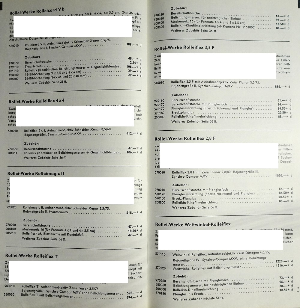 interessant die Preisliste. Ich habe mal in meine "Deutsche Photokataloge" geschaut und dabei festgestellt, dass Rollei erst ab 1965 darin auftaucht. Wie dem auch sei, im "Deutscher Photo-Katalog" von 1965, Seiten 34/35 sind diese Preise zu finden: