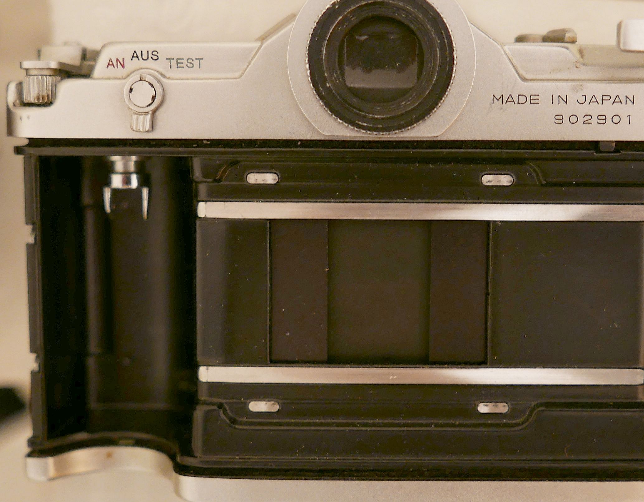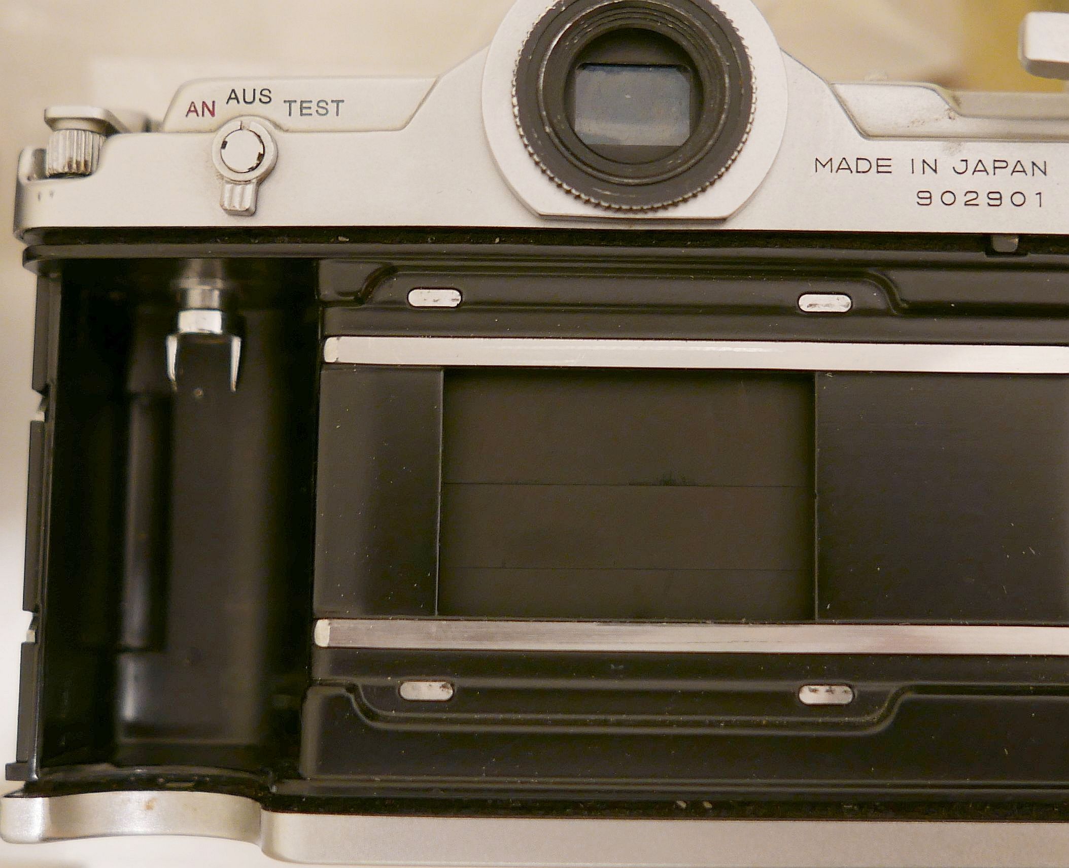 Das weiße Kunststofffenster an der linken Prismenwand dient der Beleuchtung der eingespiegelten Belichtungsmesser-Skala. Der Rückspulhebel wurde möglichst weit nach außen versetzt, um ausreichend Platz für die Mechanik der Automatik zu haben. Bei dem Modell (S)P war das nicht nötig.