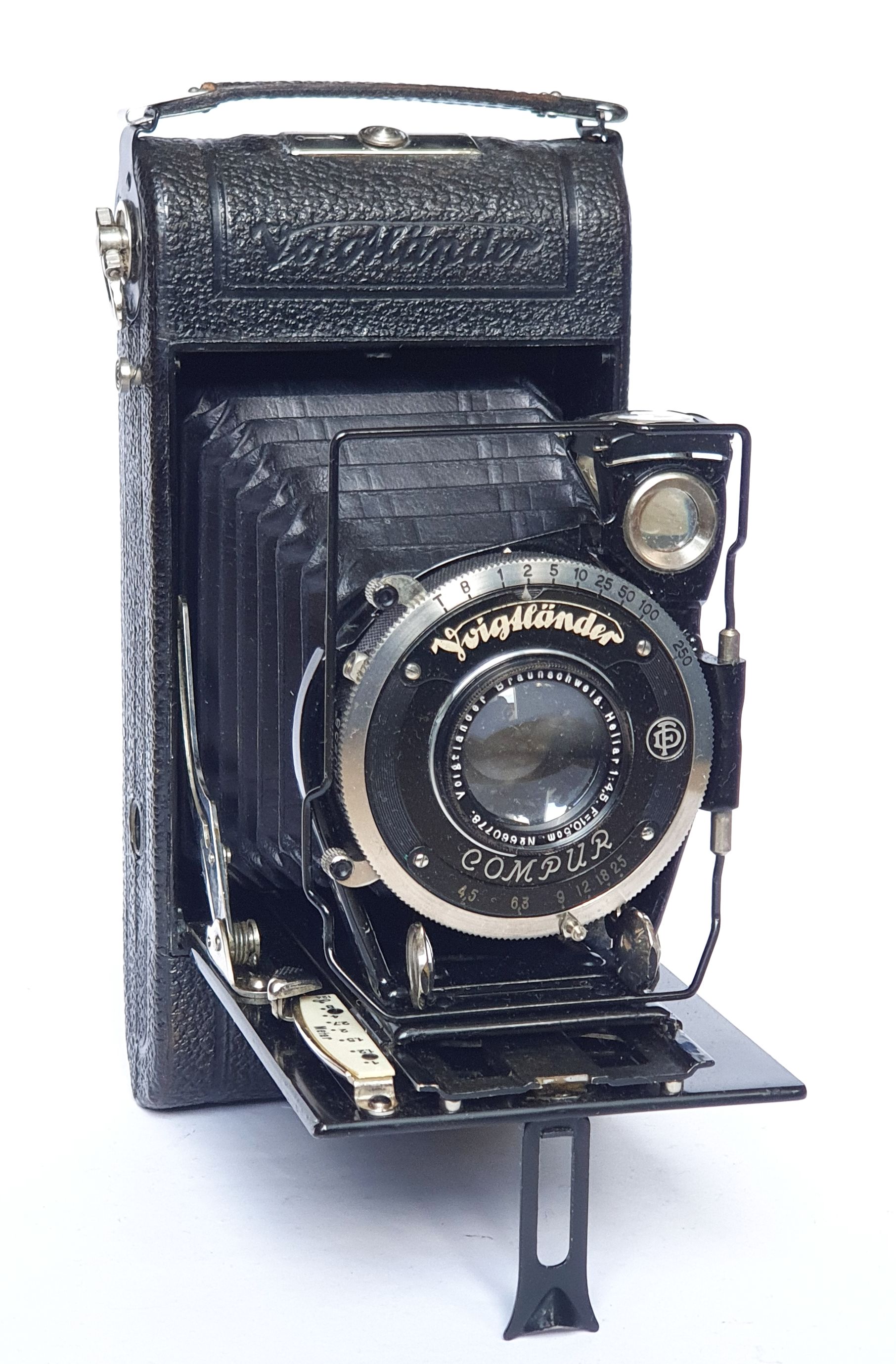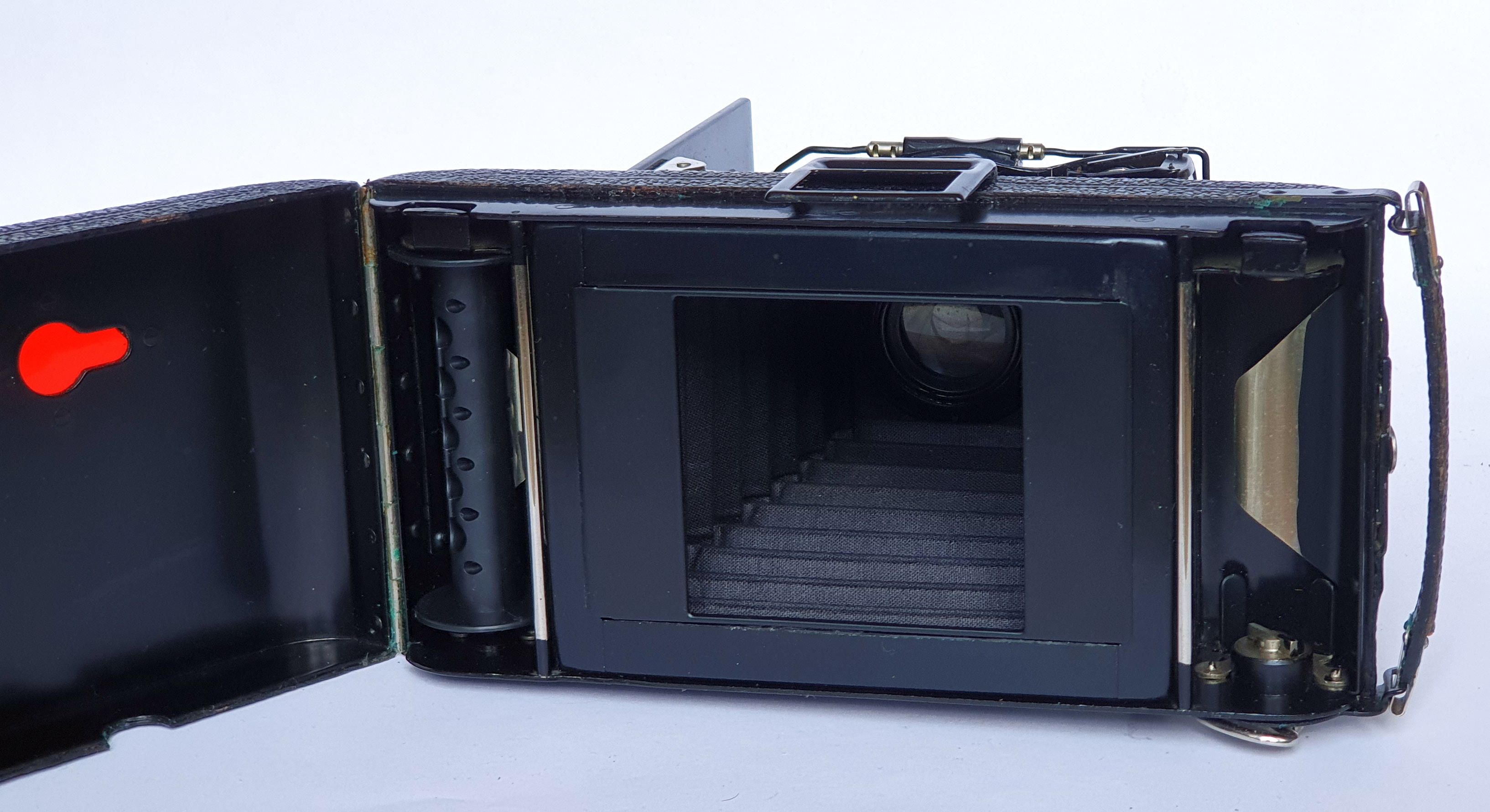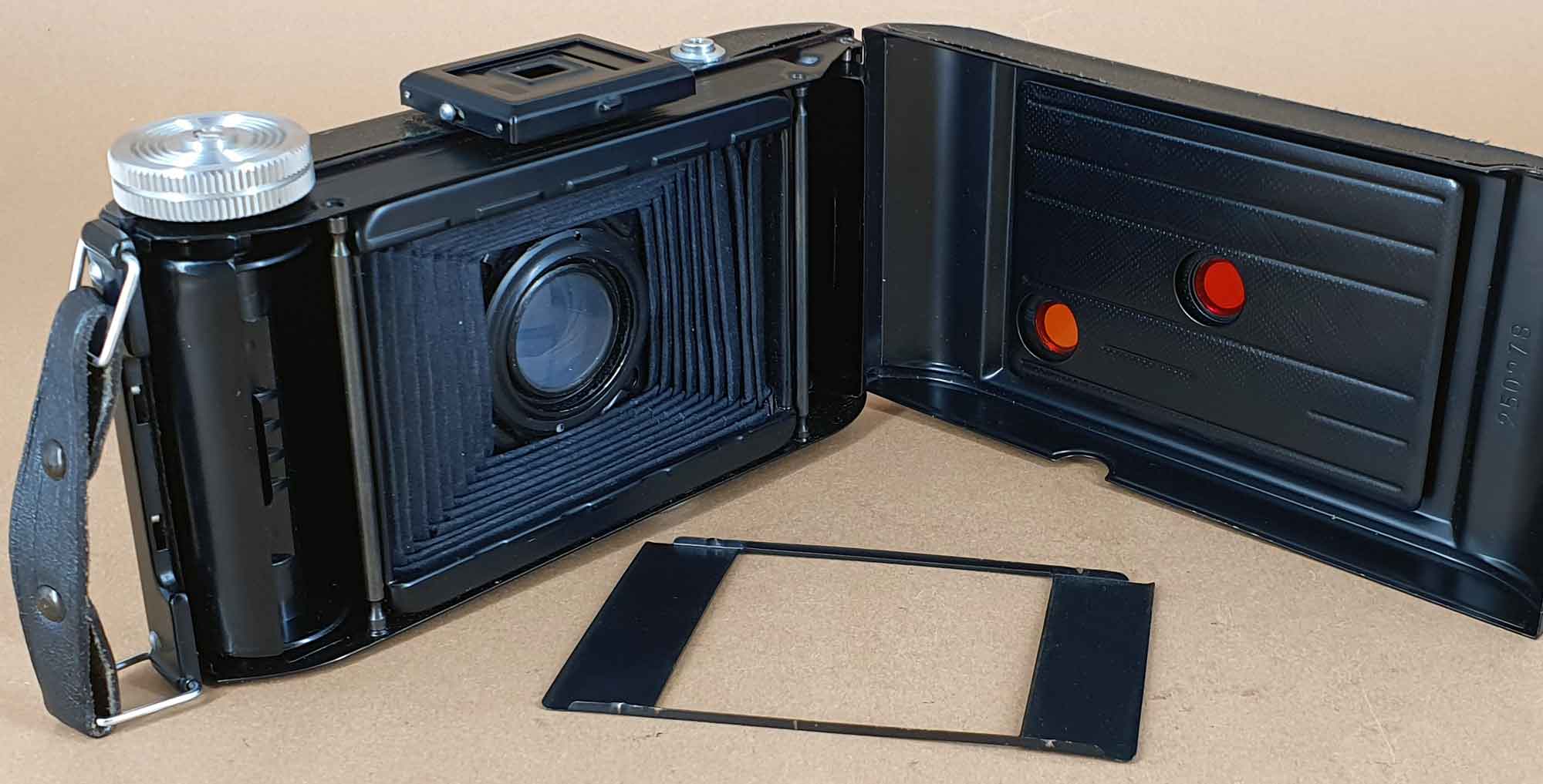 besten Dank für die Erinnerung an Rainer und den Deutungsversuch an Axel. Ich hatte die Maske zwischenzeitlich mal an jeder infrage kommenden Kamera von mir ausprobiert. Mechanisch passen würde sie an eine Rollfilmkamera von Voigtländer (siehe Bilder). Nur leider hat die kein zweites Filmfenster für den 6 x 6 Transport. Überhaupt hab ich bei Voigtländer immer nur den Maskeneinsatz für 4,5 x 6 gesehen. Das Problem ist daher nach wie vor offen.