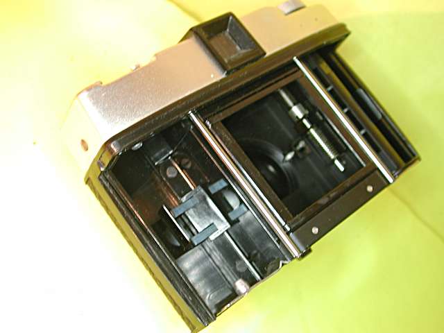 Der Gegensatz dazu: die Agfa Isoly mit dem Color-Apotar Dreilinser und dem Pronto-Verschluß hingegen hat eine flache Filmbühne mit leicht drehbaren Metallrollen und einer flachen Filmandruckplatte aus Metall. Deren Flachfedern sind an einer Seite fest eingenietet, an der anderen Seite in Schlitzen beweglich befestigt.