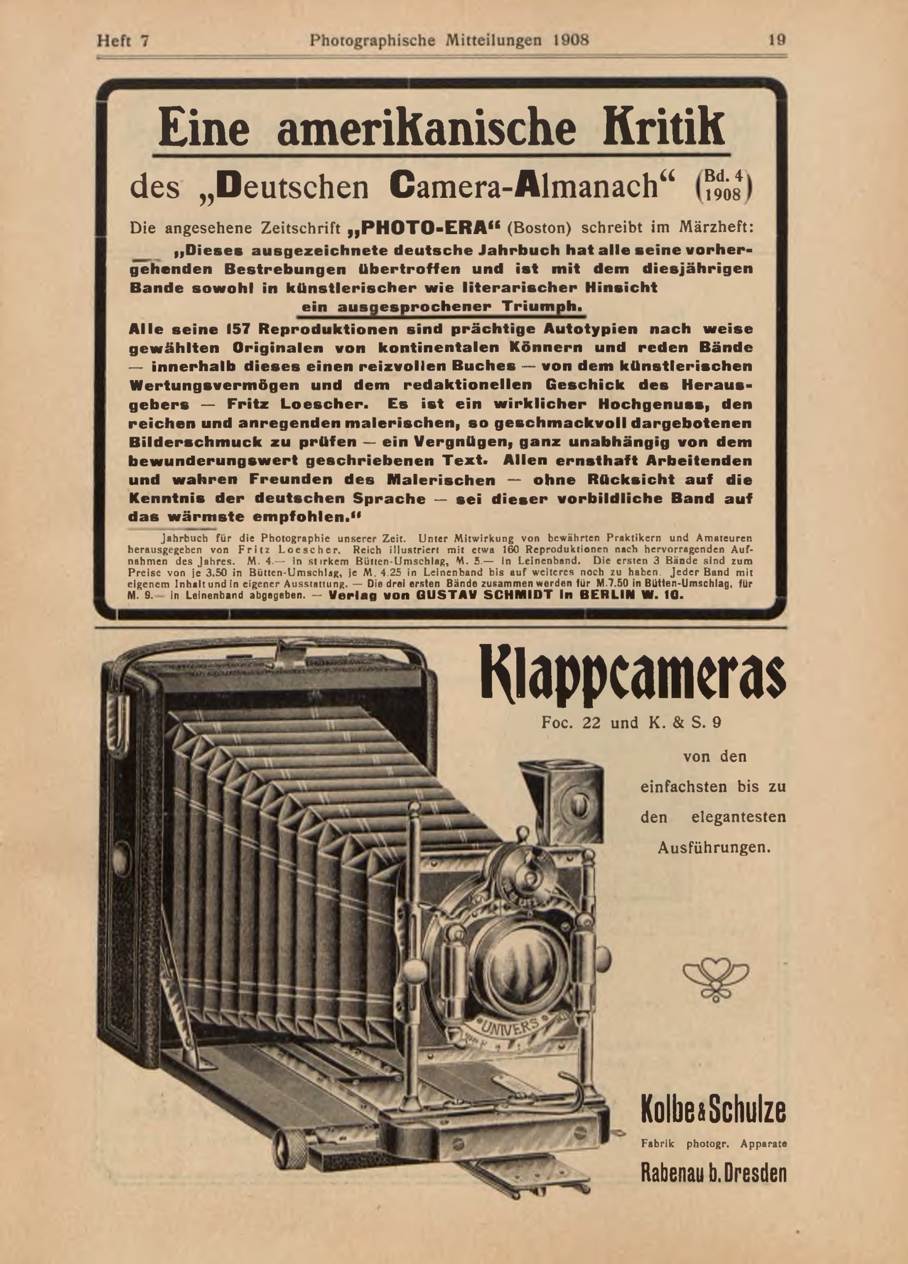 Dieses Mal möchte ich (vor allem die Liebhaber von Kameras aus der Zeit vor dem ICA) auf die folgende Anzeige aufmerksam machen, in der eine von Kolbe & Schulze verkaufte Kamera zu sehen ist, und zwar nicht so sehr wegen der Kamera selbst oder ihrer möglichen Herkunft, sondern wegen der Tatsache, dass sie eindeutig mit einem Univers-Verschluss ausgestattet ist. Einige von Ihnen haben diese Anzeige vielleicht schon gesehen.