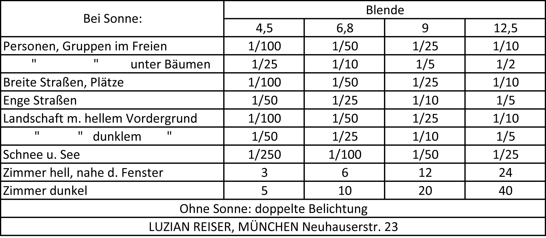 Das Schild ist auch keine der üblichen Tiefenschärfentabellen, sondern eine Art Belichtungsempfehlung. Da es schlecht lesbar ist, habe ich es mal abschriftlich beigefügt.