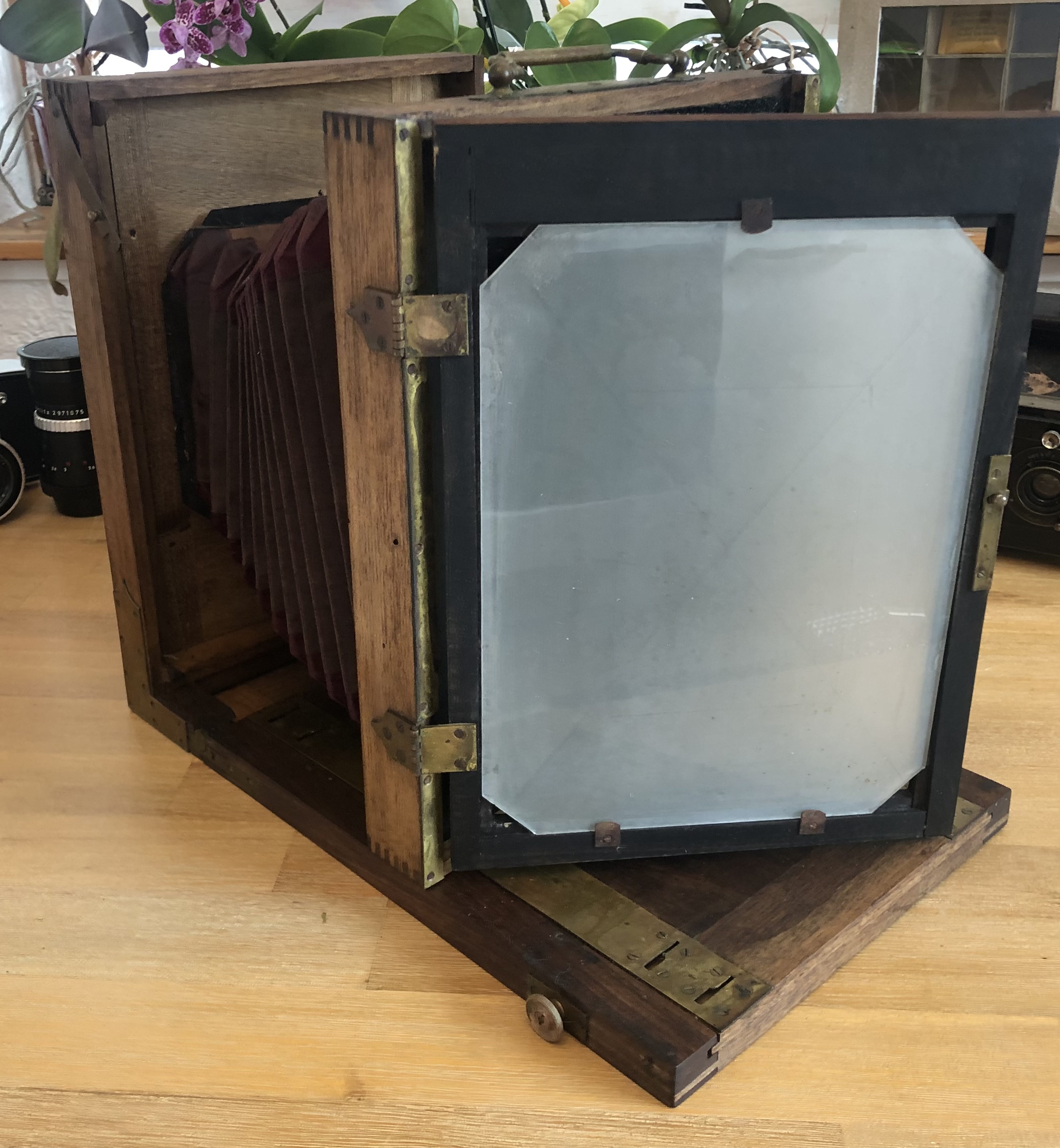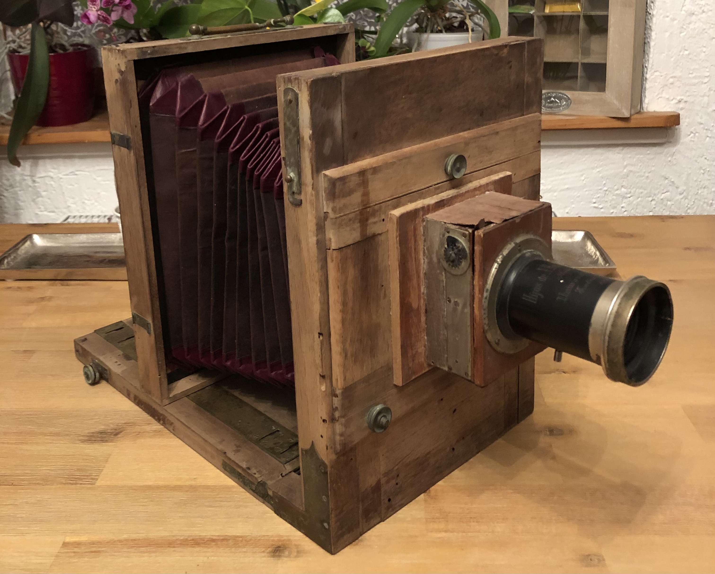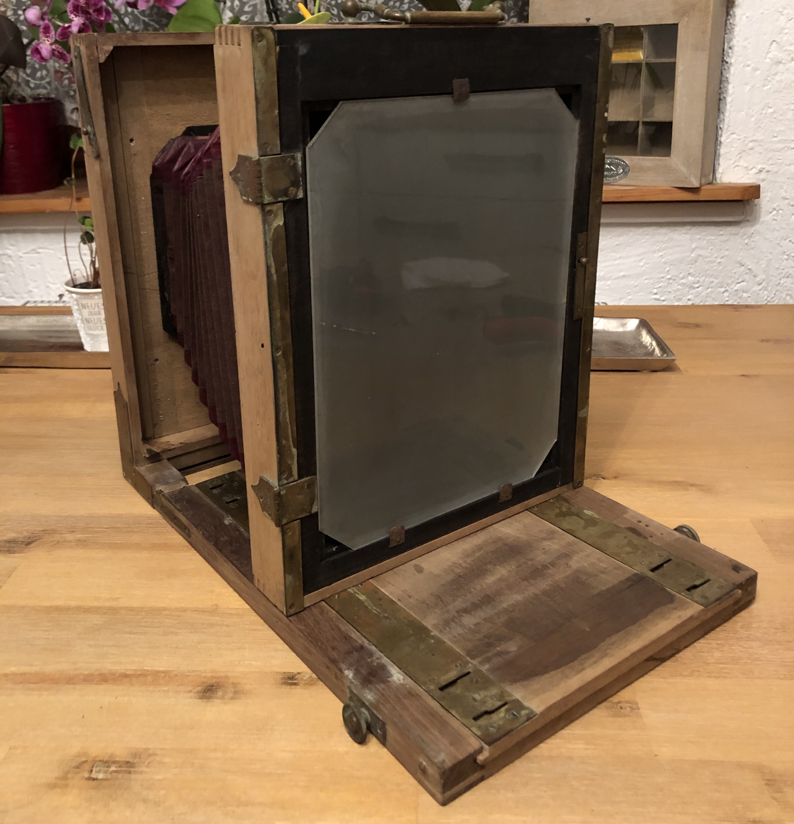 Die Ausgangslage: die Kamera war einige Jahre als Dekoration in einem Wintergarten der Sonne ausgesetzt bevor sie dann für 30 Jahre in einem - immerhin trockenen - Keller verschwand. Das Holz war erstaunlicherweise nicht lackiert und ein Vorbesitzer hat das Objektivbrett modifiziert indem er die Öffnung vergrößerte und mittels eines Vorbaus einen Rouleau-Verschluss zwischen Objektivbrett und Objektiv installierte. Der Balgen war ausgeblichen und stellenweise hat sich das Kantenleder abgelöst, ebenso wurde der Tubus des Objektives schwarz nachlackiert.