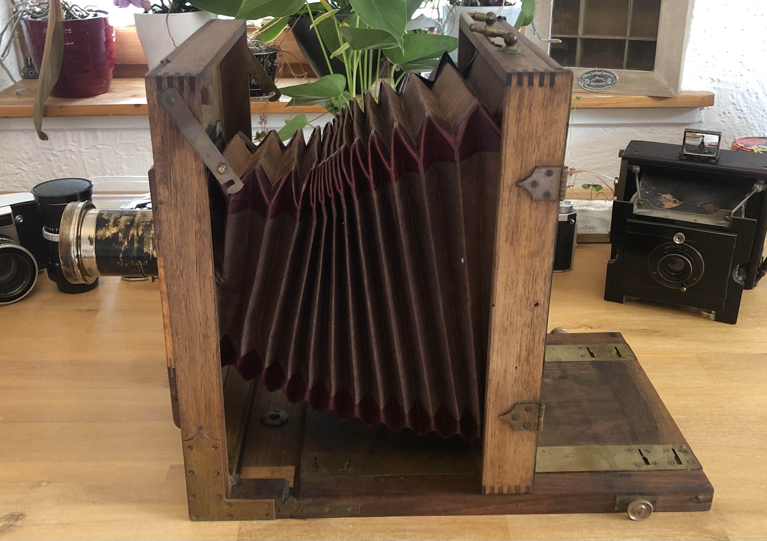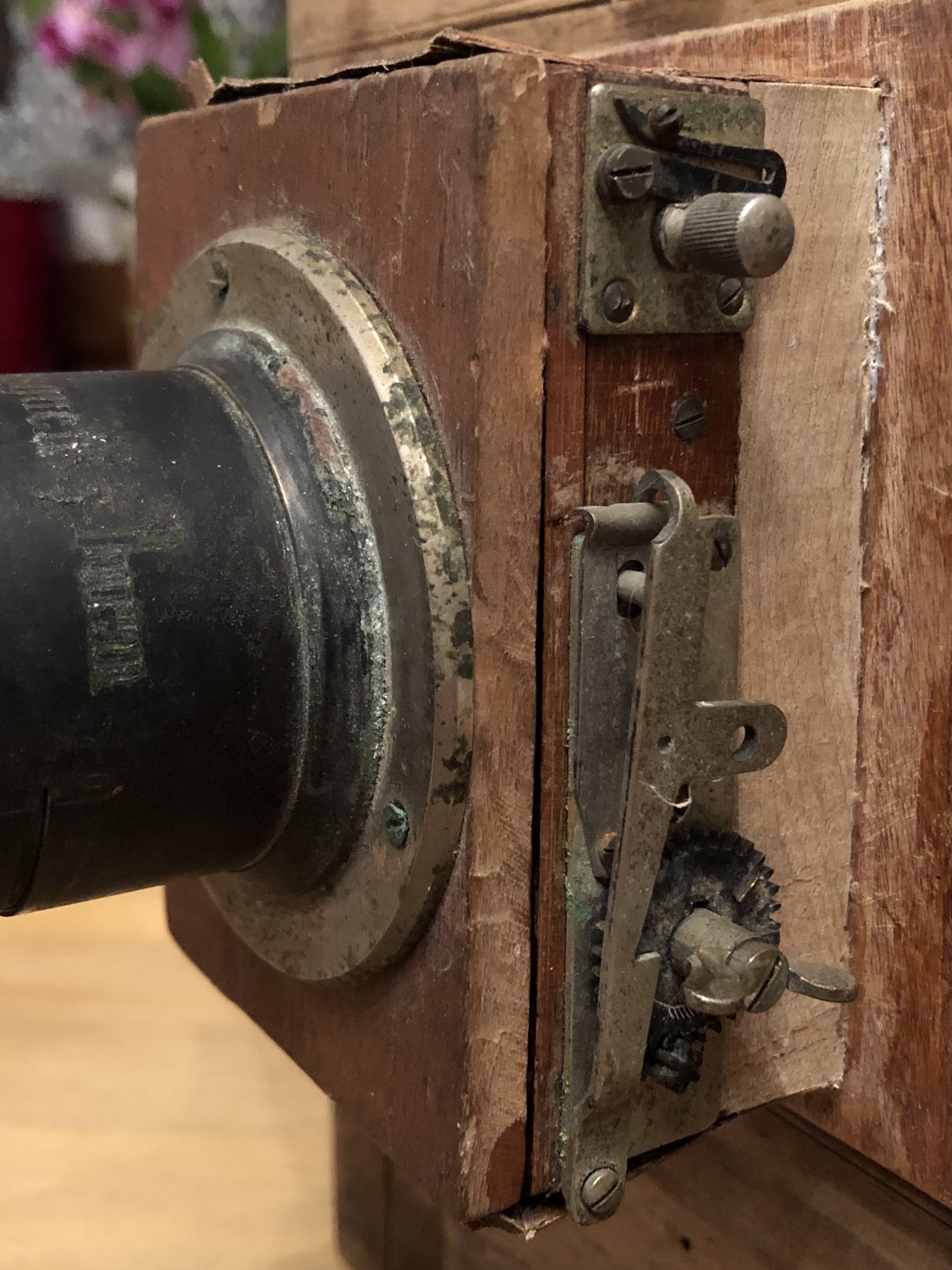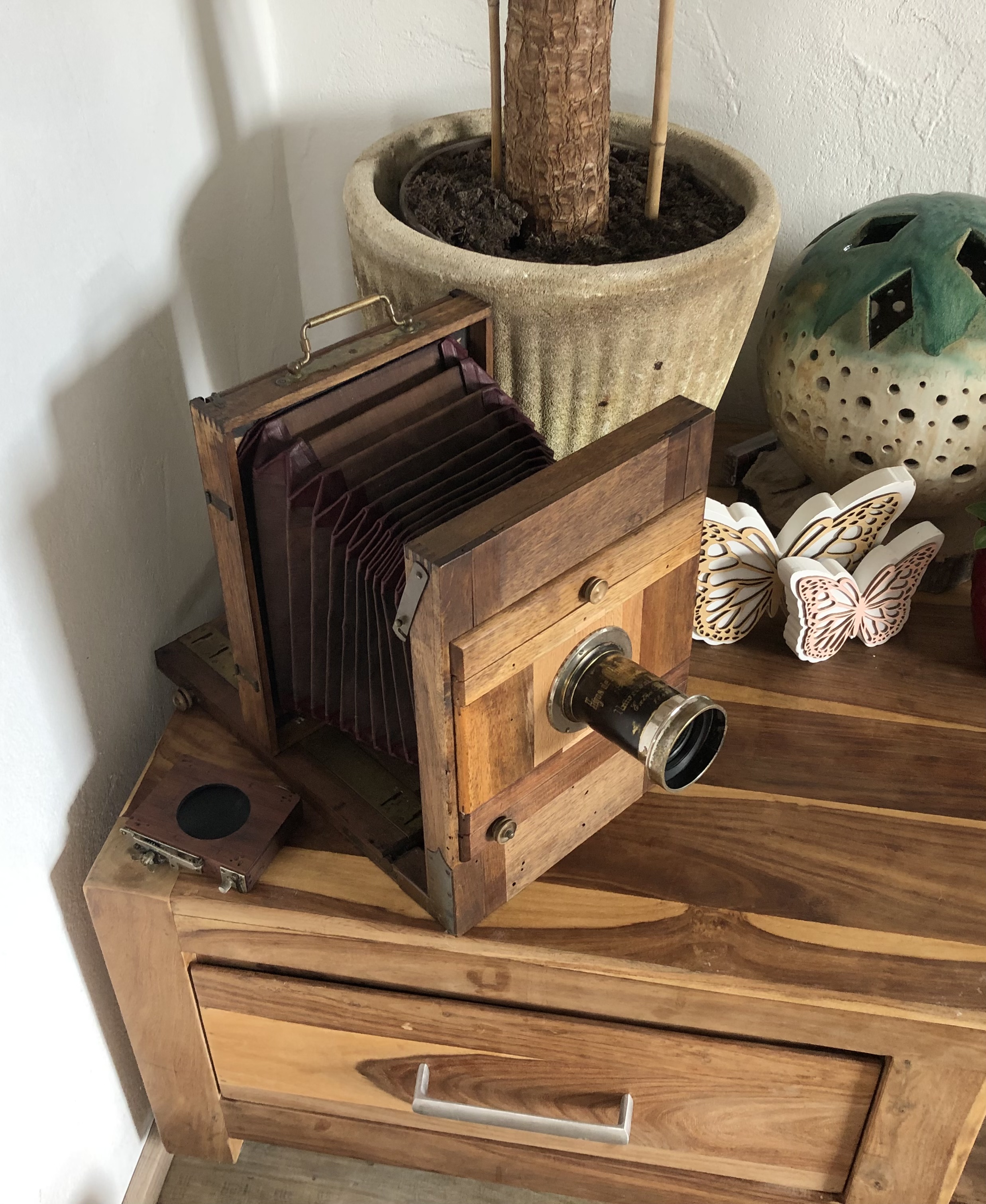 Die Ausgangslage: die Kamera war einige Jahre als Dekoration in einem Wintergarten der Sonne ausgesetzt bevor sie dann für 30 Jahre in einem - immerhin trockenen - Keller verschwand. Das Holz war erstaunlicherweise nicht lackiert und ein Vorbesitzer hat das Objektivbrett modifiziert indem er die Öffnung vergrößerte und mittels eines Vorbaus einen Rouleau-Verschluss zwischen Objektivbrett und Objektiv installierte. Der Balgen war ausgeblichen und stellenweise hat sich das Kantenleder abgelöst, ebenso wurde der Tubus des Objektives schwarz nachlackiert.
