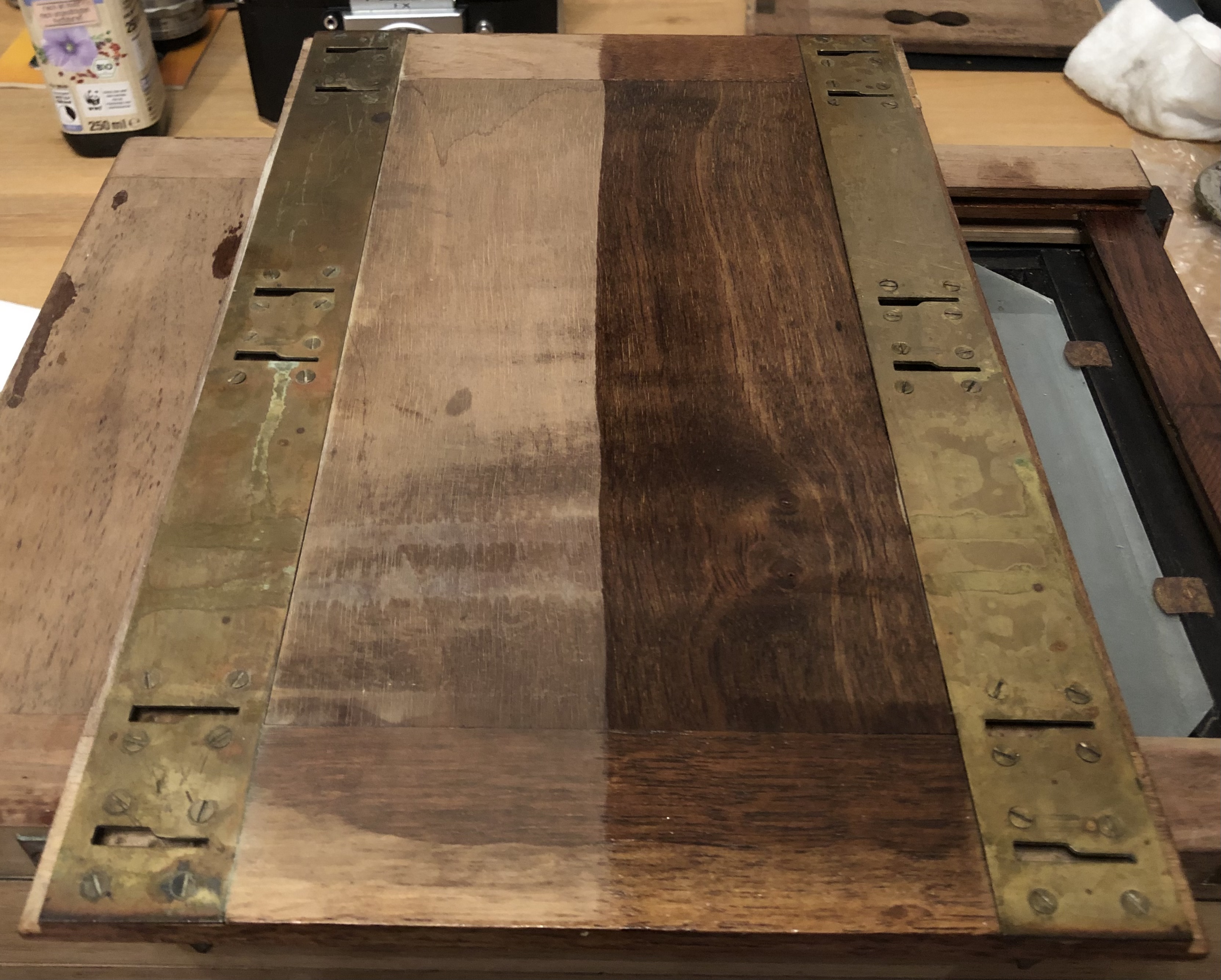 Das Kameragehäuse wurde soweit nötig zerlegt und ebenfalls mit Leinöl behandelt (Sicherheitshinweis siehe oben), das Ergebnis hat mich sehr überrascht und ich musste zweimal auftragen da das Holz sehr durstig war.
