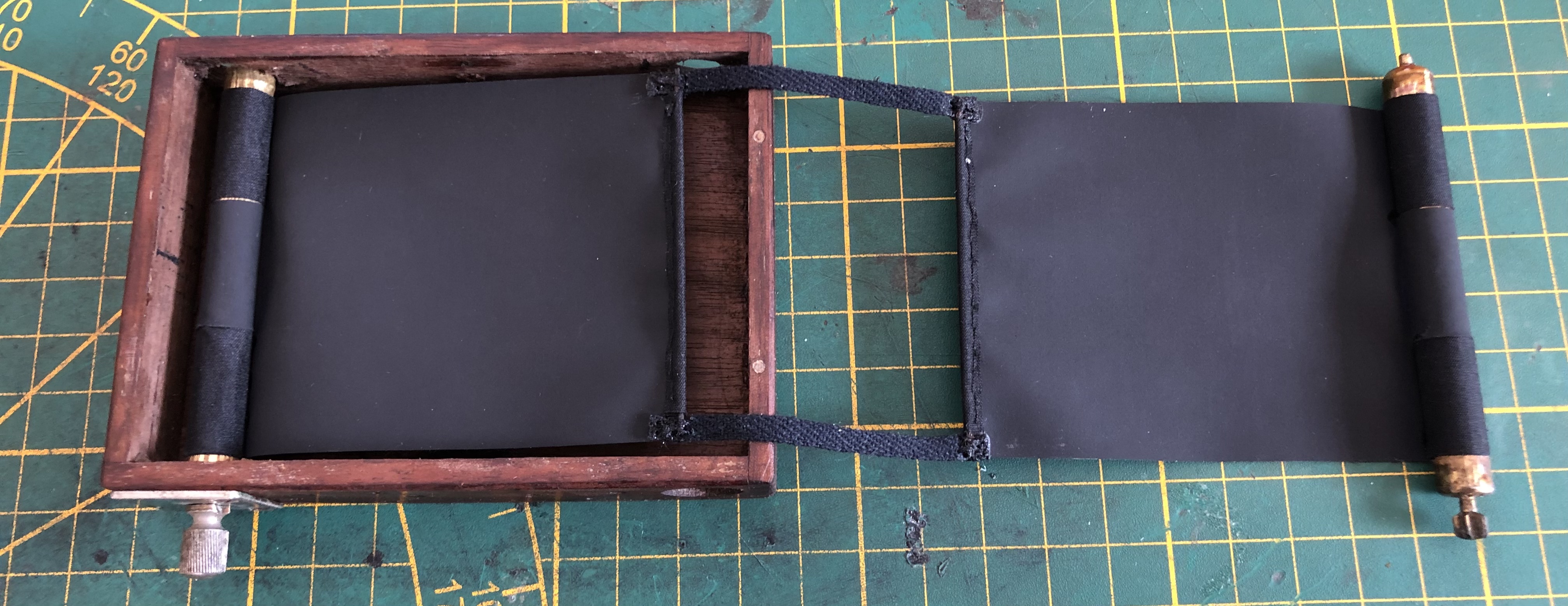 Der Verschluss wurde komplett demontiert, die Metallteile ebenfalls mit der Natronpaste bearbeitet, die Verschlussvorhänge erneuert und das Holzgehäuse lediglich mit Leinöl geölt (ACHTUNG! Dafür keine Baumwolltücher verwenden - Gefahr der Selbstentzündung!!!).