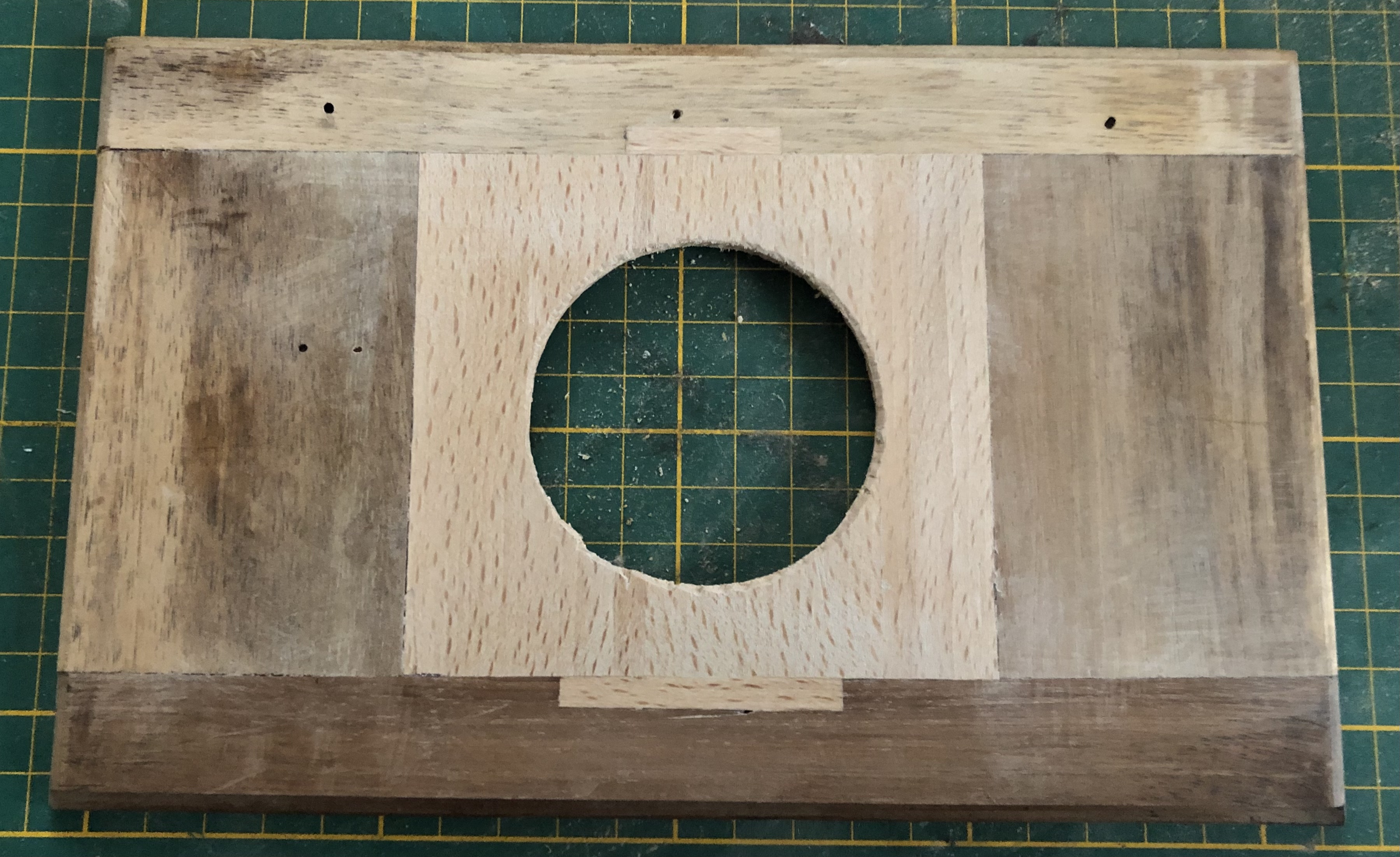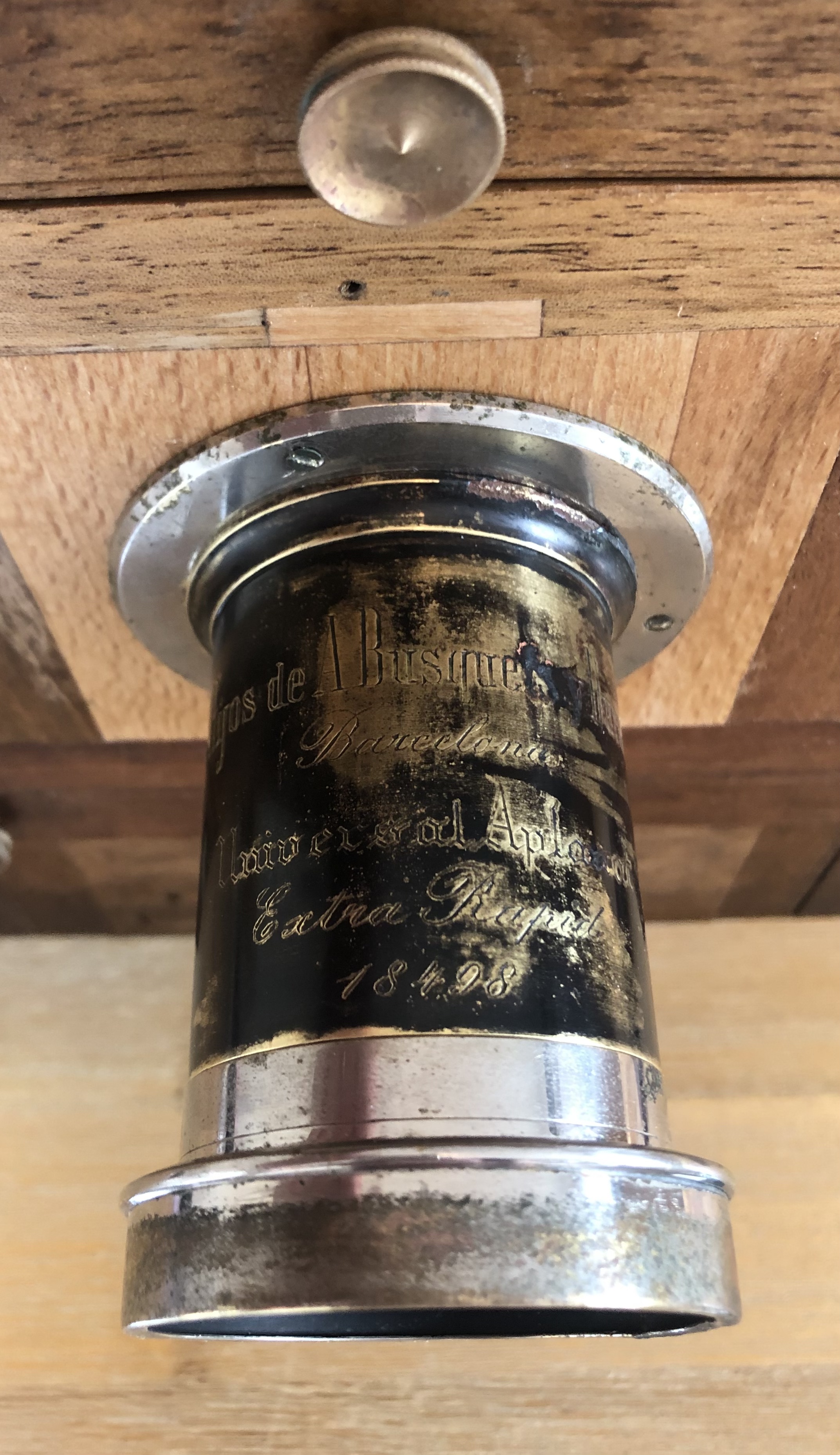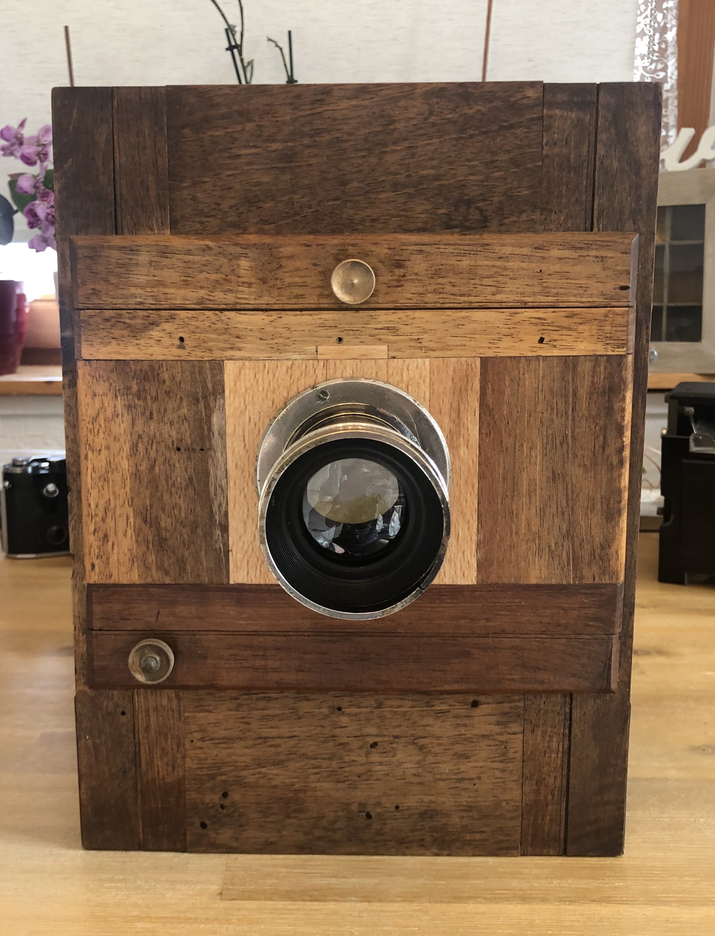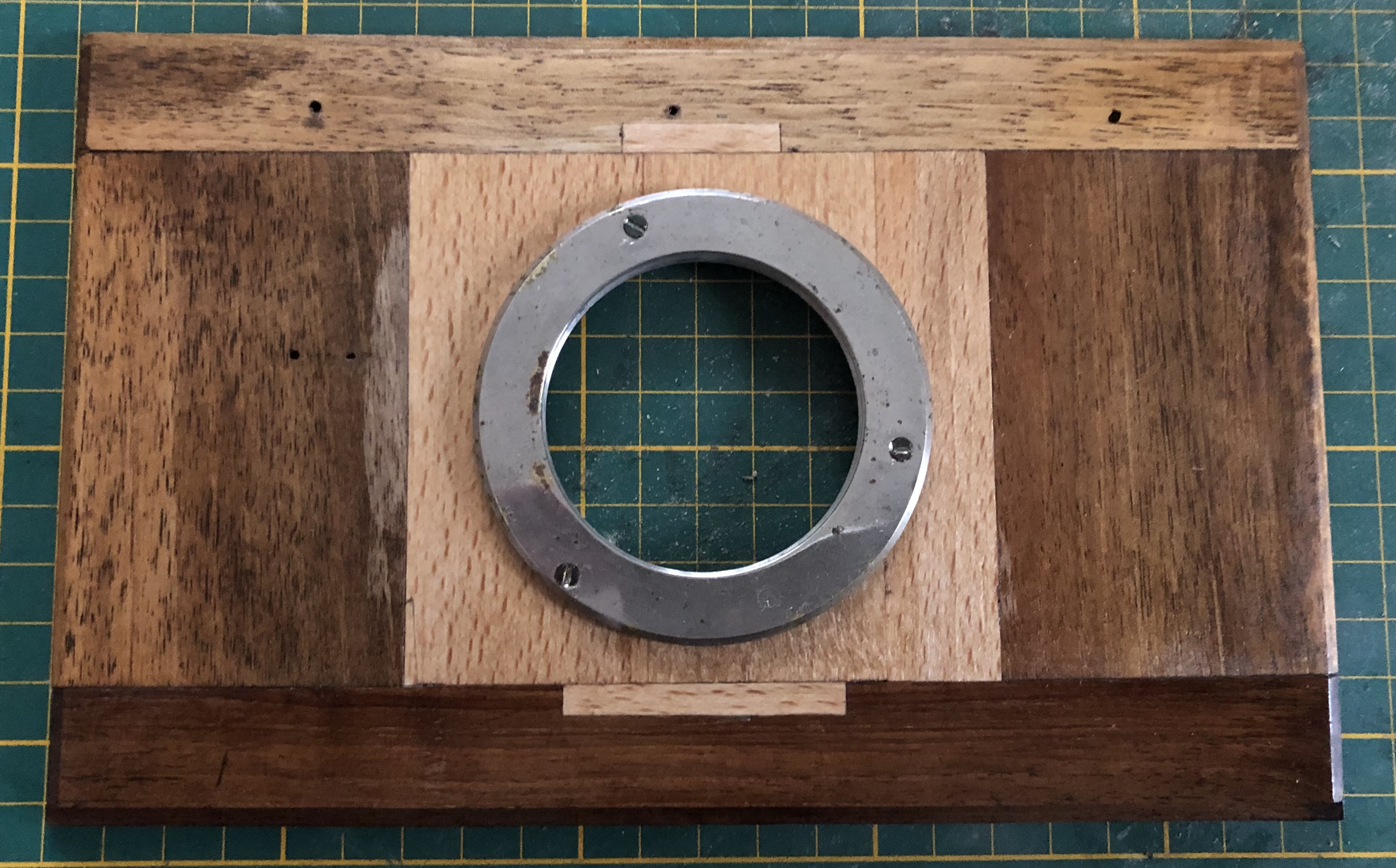 Eine größere Aufgabe war die Wiederherstellung des Objektivbrettes. Hier habe ich die Originalsubstanz soweit möglich erhalten, die Fehlstellen mit Buchenholz ausgefüllt und ein neues passendes Loch gebohrt. Anschließend musste ich es nur noch ölen und das Objektiv wieder installieren.