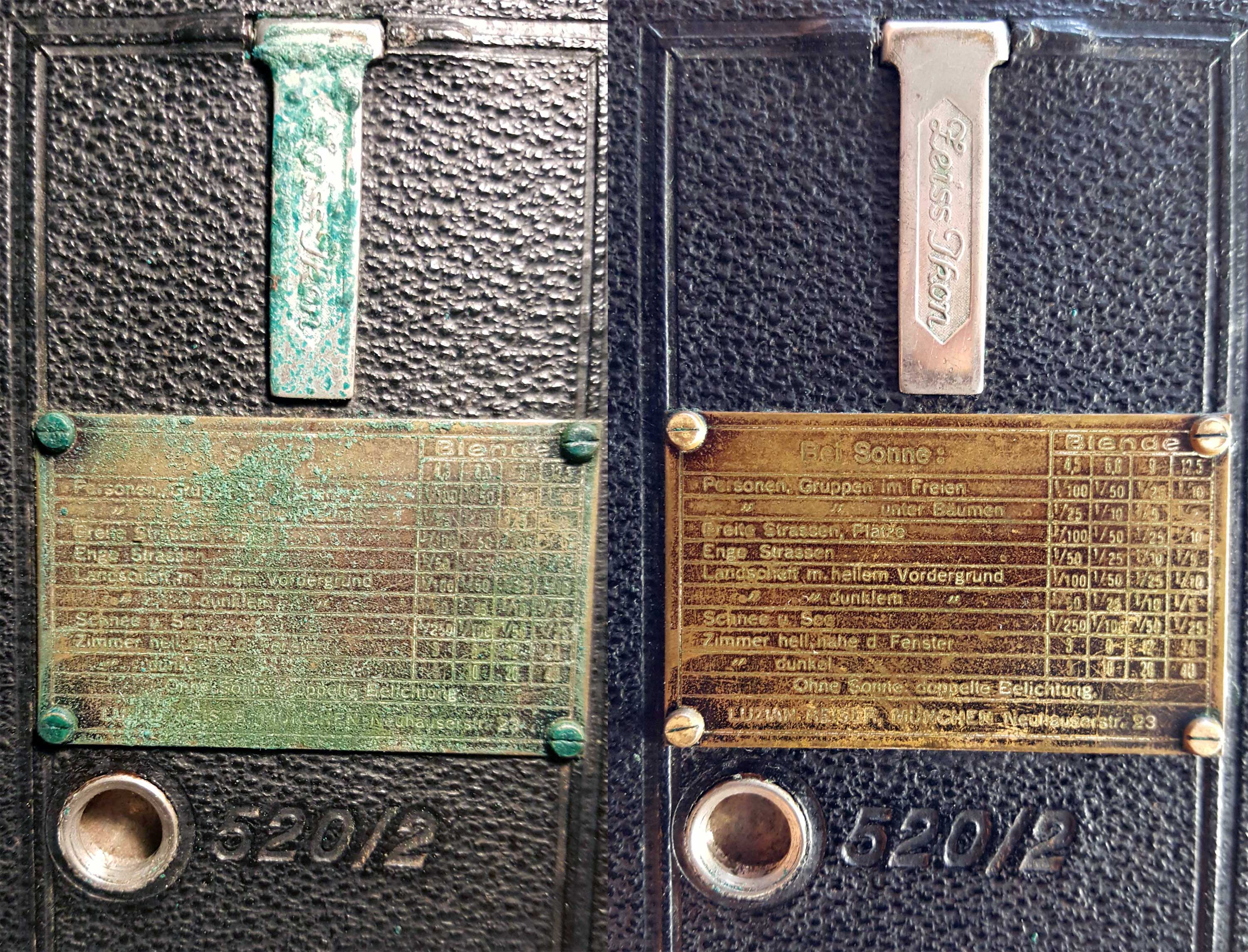 Ja, ein bisschen Reinigung macht doch eine Menge aus. Im vorliegenden Fall hätte ich mich noch gefragt, ob man die Schärfentiefentabelle erhalten soll, zumal man darunter auch Grünspan vermuten kann. Aber immerhin hat die ein Nutzer nachträglich angebracht, sie gehört insofern zur Geschichte dieser Ikonta. Außerdem hätte man sonst Löcher im Boden. Anderereits sind die dicken Schrauben schon ziemlich brachial...
