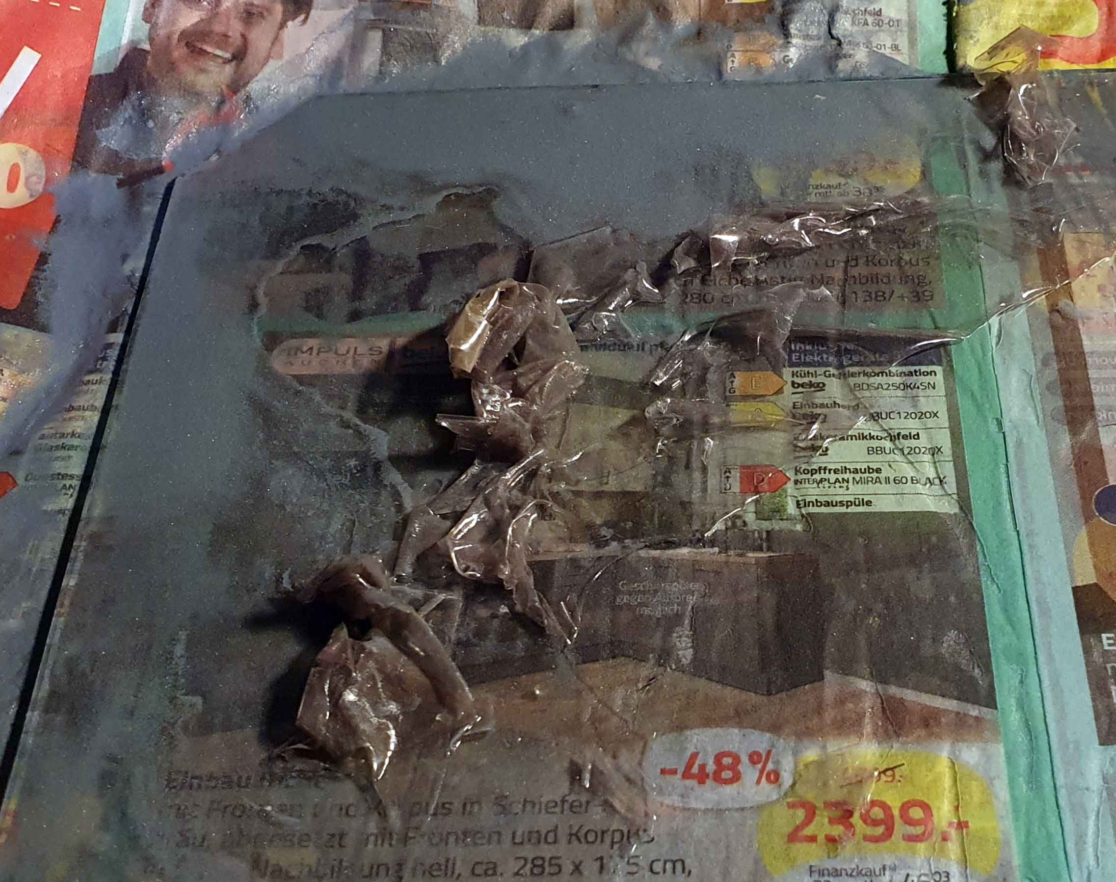 Die Platte lieg auf einem Stück Werbezeitung und in der Mitte ist ein wenig Schleifpulver aufgebracht, wozu noch ein wenig Wasser gegeben wird. Das Schleifmittel ist Siliziumcarbit in der Körnung 500. Im Web finden sich verschiedene Tipps zum Schleifen einer Mattscheibe, die als Körnung meist 400 bis 600 Micron empfehlen. Als Schleifwerkzeug dient eine zweite kleinere Glasplatte (in meinem Fall ebenfalls eine alte Fotoplatte im kleineren Format 9x12). Die Fotoschicht ließ sich mit dem feinen Schleifmittel nicht abschleifen, aber nachdem die Schicht aufgerissen war, konnte man sie recht einfach abziehen bzw. abreiben: