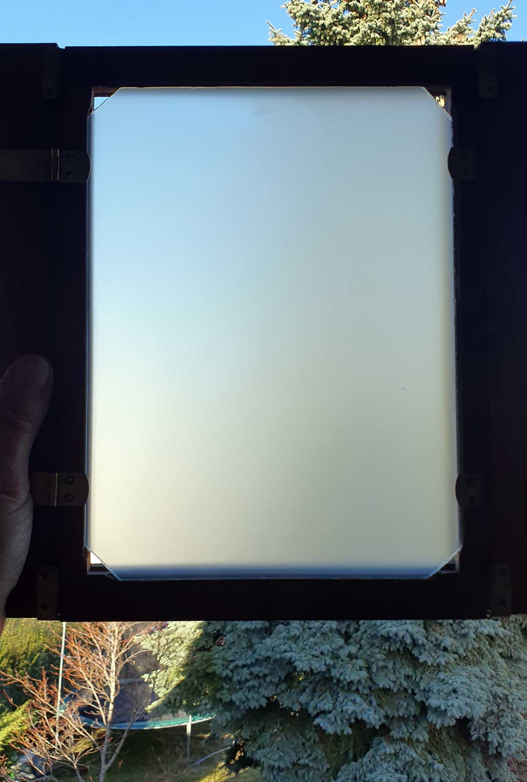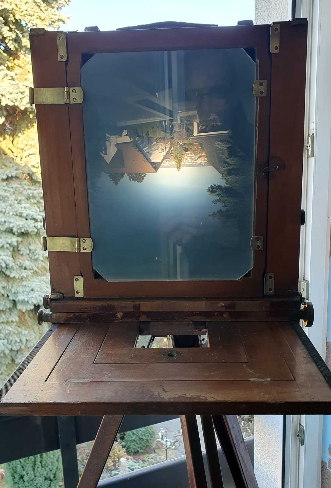 Als praktischen Nebeneffekt der Schleiferei habe ich nun auch noch eine Mattscheibe im Format 9x12 (das Arbeitswerkzeug).