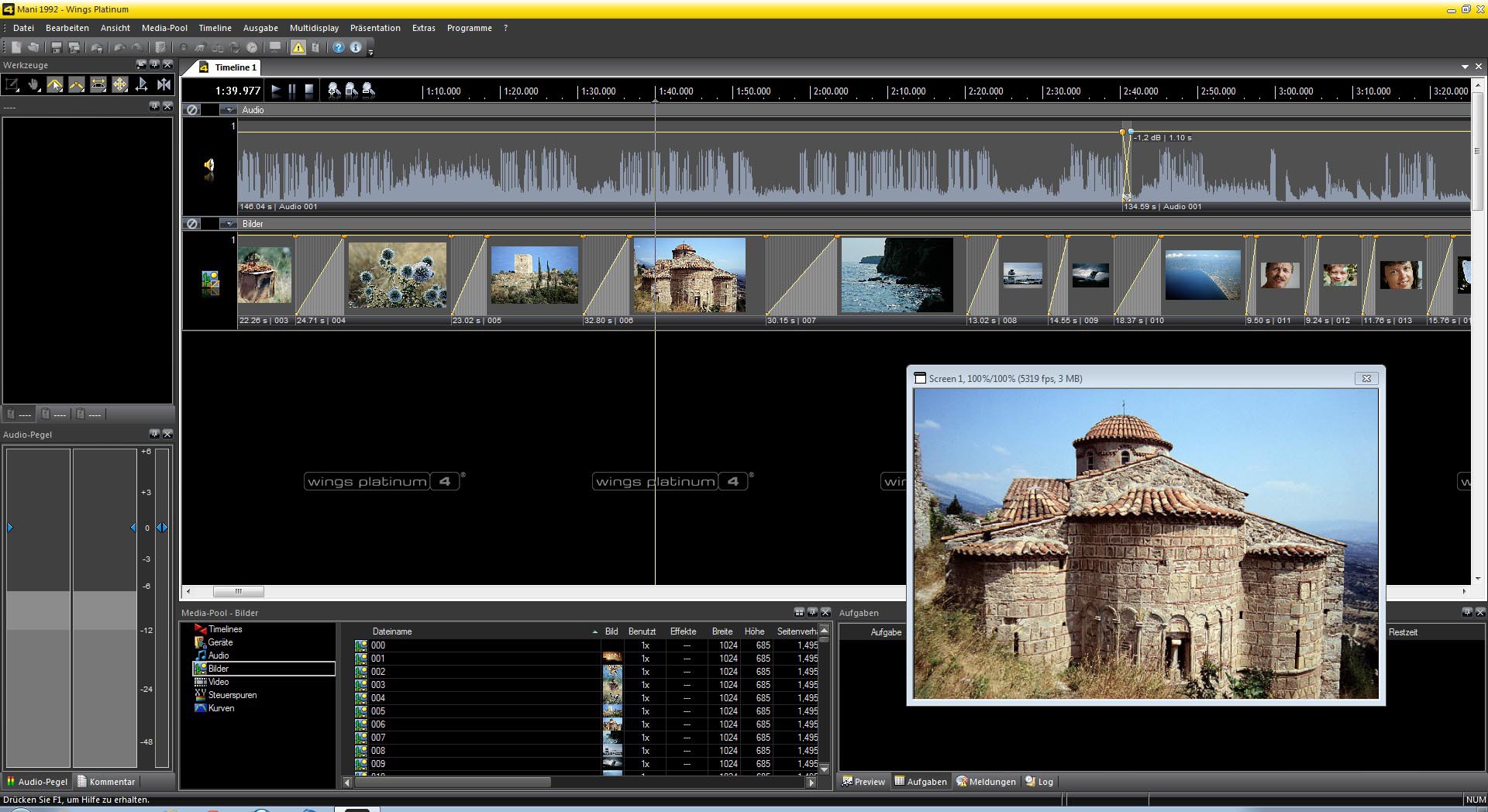 Die Arbeit mit Wings gestaltet sich ähnlich wie die Arbeit mit einem Video-Schnittprogramm. Die Digibilder (oder die digitalisierten Dias) werden aus einem "Mediapool" manuell oder auch automatisch mit vorgewählter Stand- und Überblendzeit in der Timline platziert. Der Ton kann direkt im Programm über die Soundkarte von einer analogen Quelle oder einer CD importiert und in die Audiospur platziert werden. Dass alles funktioniert in Echtzeit und jedes Bild und jede Überblendung kann nachträglich beliebig verändert werden. Ebenso ist der Tonschnitt in der Audiospur möglich. Die Bildqualität hängt nur von der Größe der importierten Bilddateien ab und ist nicht durch die geringe Videoauflösung wie in früheren SD-Videoschnittprogrammen reduziert!