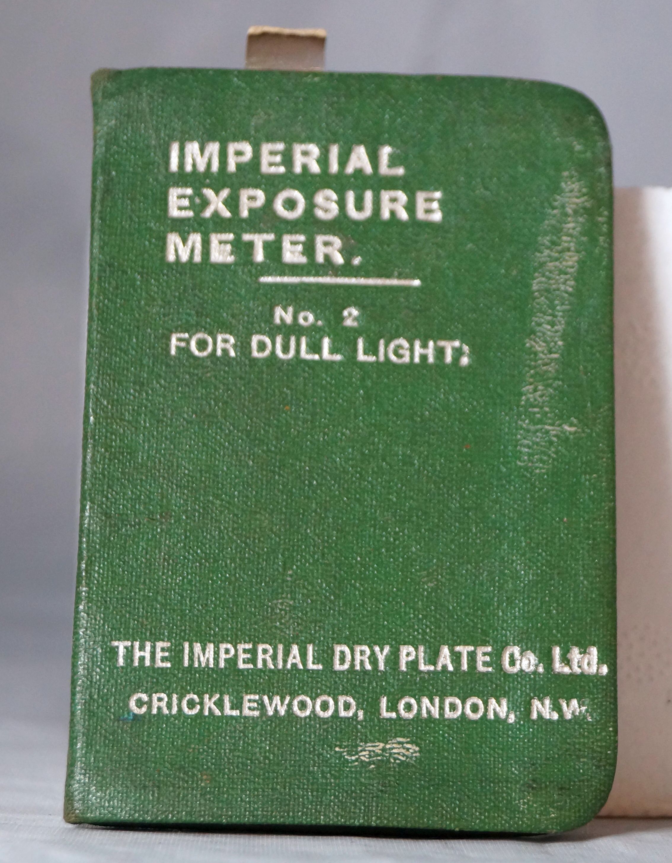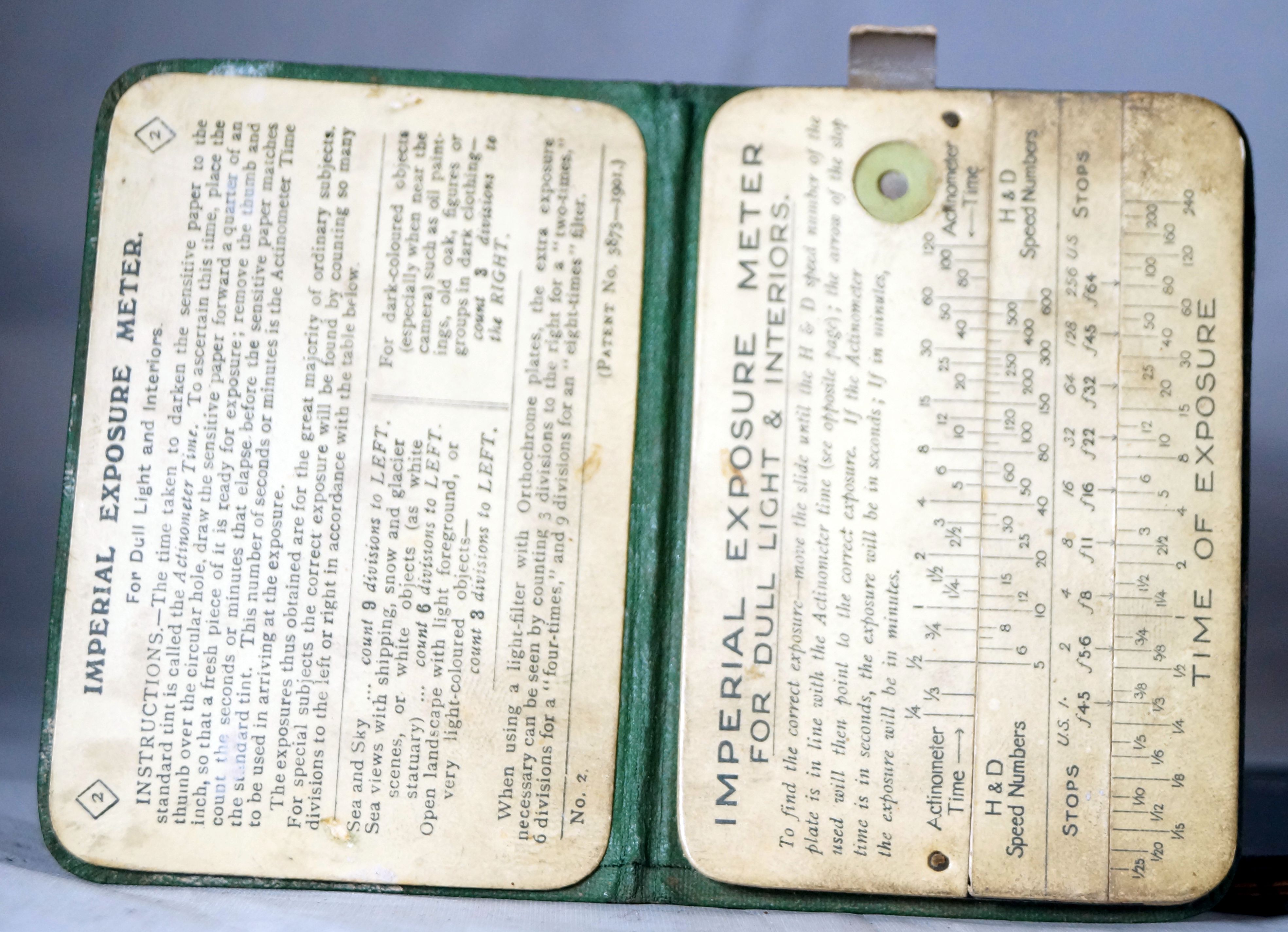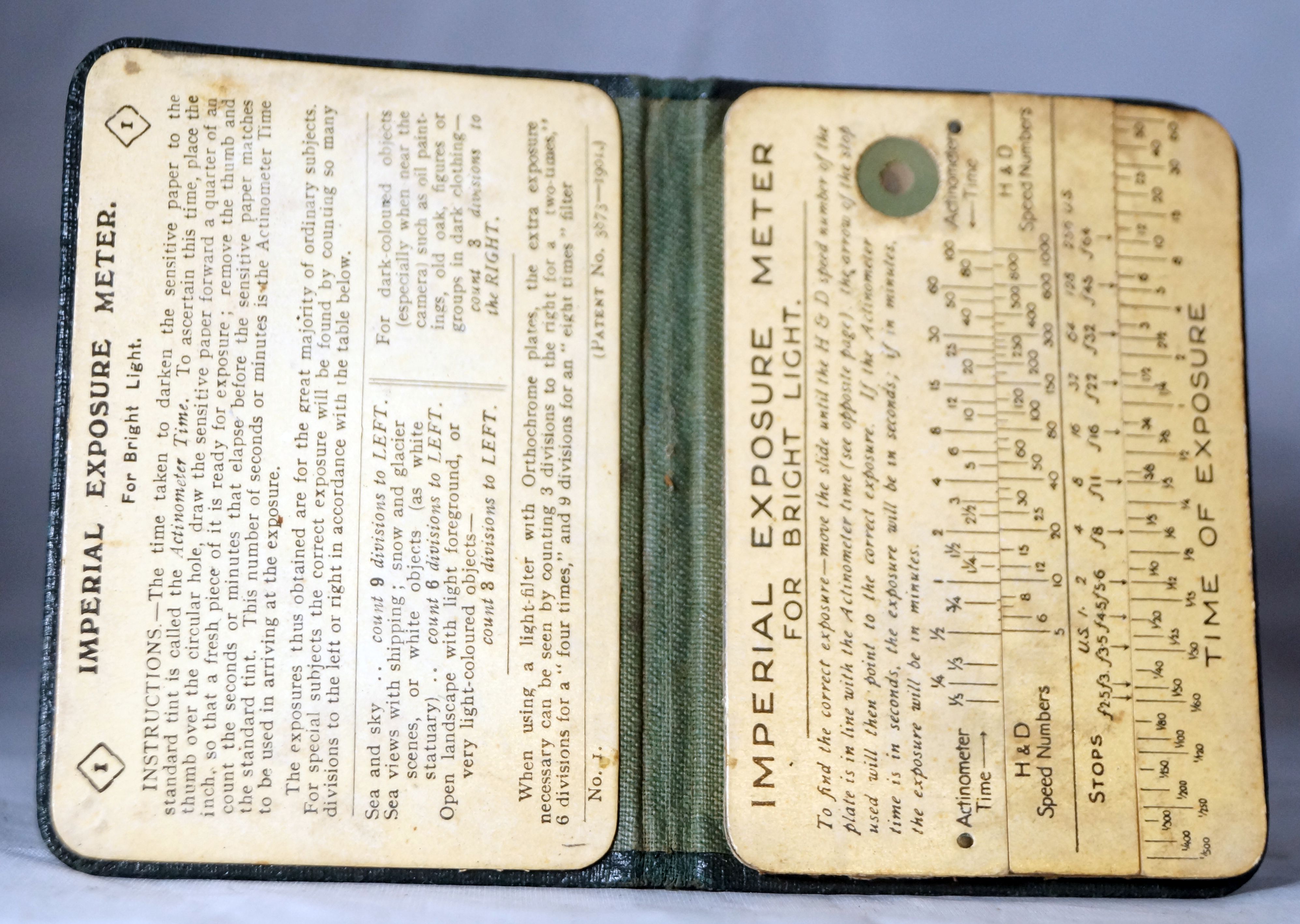 Hallo, als ich sie gesehen hatte, musste ich sie haben. Es handelt sich dabei um zwei Belichtungsmesser für Fotoplatten. Hergestellt wurden sie von der Firma Imperial in London. Ein Herstellungsdatum habe ich leider nicht, allerdings wurde die Firma 1918 von Ilford übernommen, und das Patent, wenn ich es richtig verstehe, wurde 1901 erteilt. Das Prinzip ist einfach, es wird ein streifen Lichtempfindliches Papier eingeschoben, die gab es in den Päckchen die auf dem letzten Bild zu sehen sind. Dann wartete man bis es sich verfärbte und stoppte die Zeit, der streifen unterhalb der Zeitleiste lässt sich verschieben, Wenn man nun des streifen anhand der gestoppten Zeit verschob, konnte man sehen welche Blende zu welcher Verschlusszeit nötig war. Ausserdem sind noch verschiedene Faktoren angegeben, wie zum Beispiel Seeblick etc. Ich habe zwei Büchlein, eins für helles und eins für schwaches Licht, ich selbst erkenne keinen Unterschied zwischen beiden, innen sind sie identisch, möglich das es verschiedene Papiere gab, und die Aufschrift auf den Büchern nur dazu diente das zu unterscheiden. Interessant ist auch das auf der Rückseite die von Imperial hergestellten Platten aufgelistet sind, vieleicht gabs die Büchlein als Werbegeschenk zu den Platten? AUf jeden Fall zwei interessante Zeitzeugen der Frühen Fotografie finde ich.