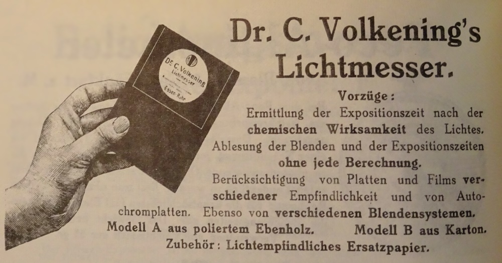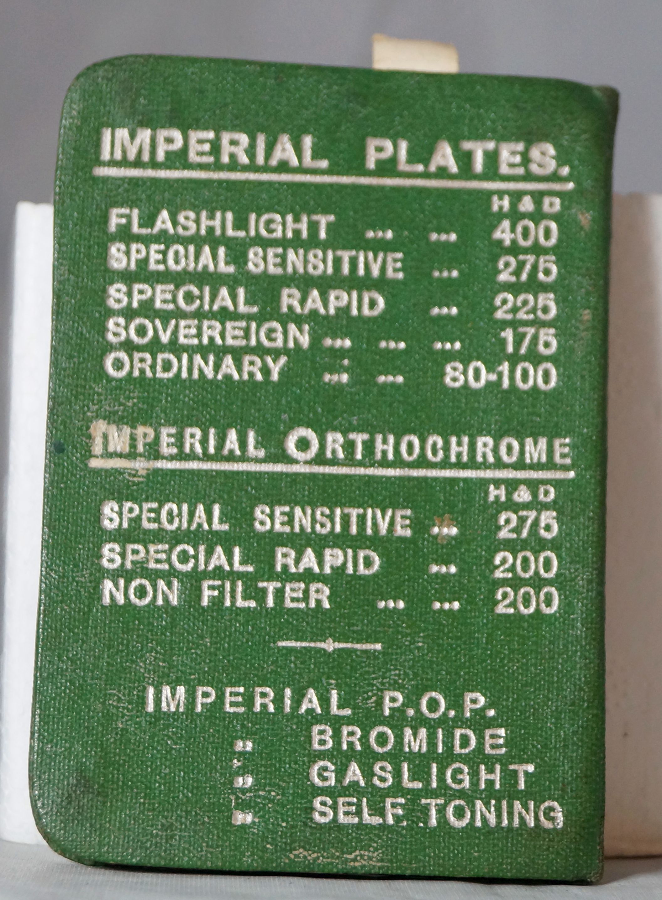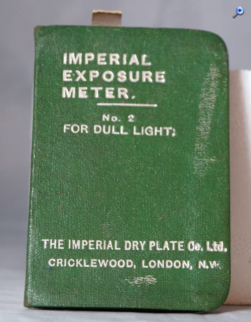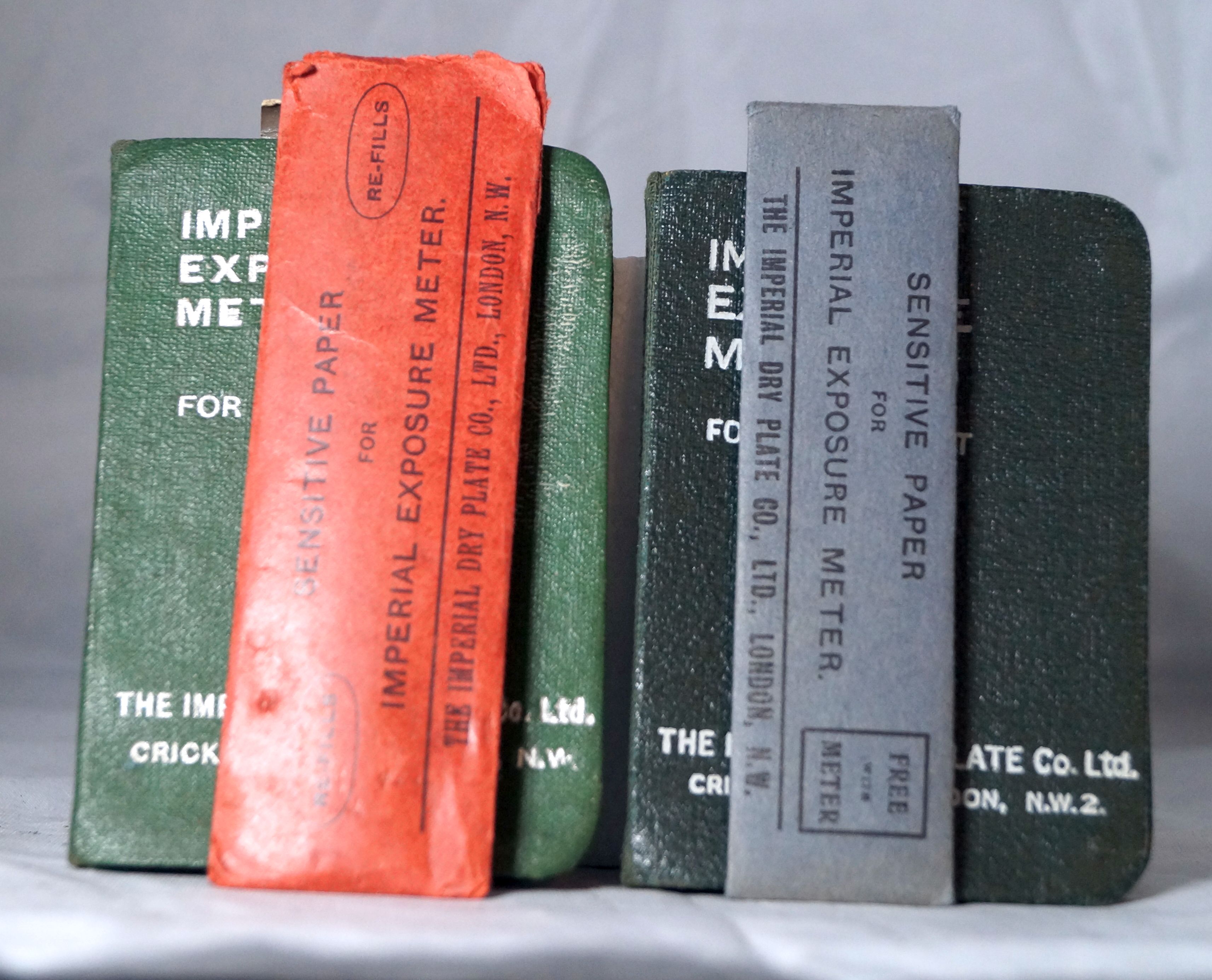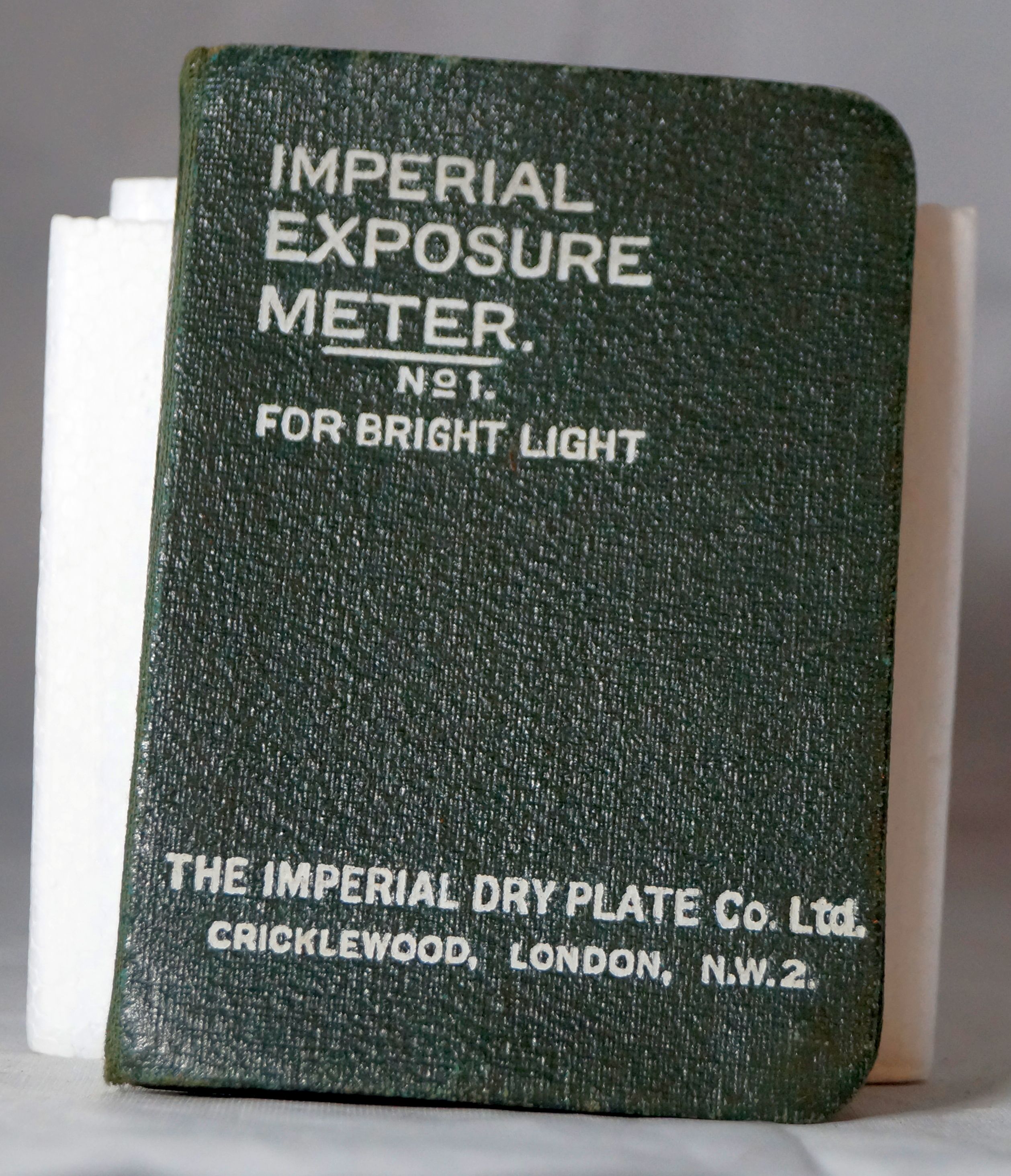 Hallo, als ich sie gesehen hatte, musste ich sie haben. Es handelt sich dabei um zwei Belichtungsmesser für Fotoplatten. Hergestellt wurden sie von der Firma Imperial in London. Ein Herstellungsdatum habe ich leider nicht, allerdings wurde die Firma 1918 von Ilford übernommen, und das Patent, wenn ich es richtig verstehe, wurde 1901 erteilt. Das Prinzip ist einfach, es wird ein streifen Lichtempfindliches Papier eingeschoben, die gab es in den Päckchen die auf dem letzten Bild zu sehen sind. Dann wartete man bis es sich verfärbte und stoppte die Zeit, der streifen unterhalb der Zeitleiste lässt sich verschieben, Wenn man nun des streifen anhand der gestoppten Zeit verschob, konnte man sehen welche Blende zu welcher Verschlusszeit nötig war. Ausserdem sind noch verschiedene Faktoren angegeben, wie zum Beispiel Seeblick etc. Ich habe zwei Büchlein, eins für helles und eins für schwaches Licht, ich selbst erkenne keinen Unterschied zwischen beiden, innen sind sie identisch, möglich das es verschiedene Papiere gab, und die Aufschrift auf den Büchern nur dazu diente das zu unterscheiden. Interessant ist auch das auf der Rückseite die von Imperial hergestellten Platten aufgelistet sind, vieleicht gabs die Büchlein als Werbegeschenk zu den Platten? AUf jeden Fall zwei interessante Zeitzeugen der Frühen Fotografie finde ich.