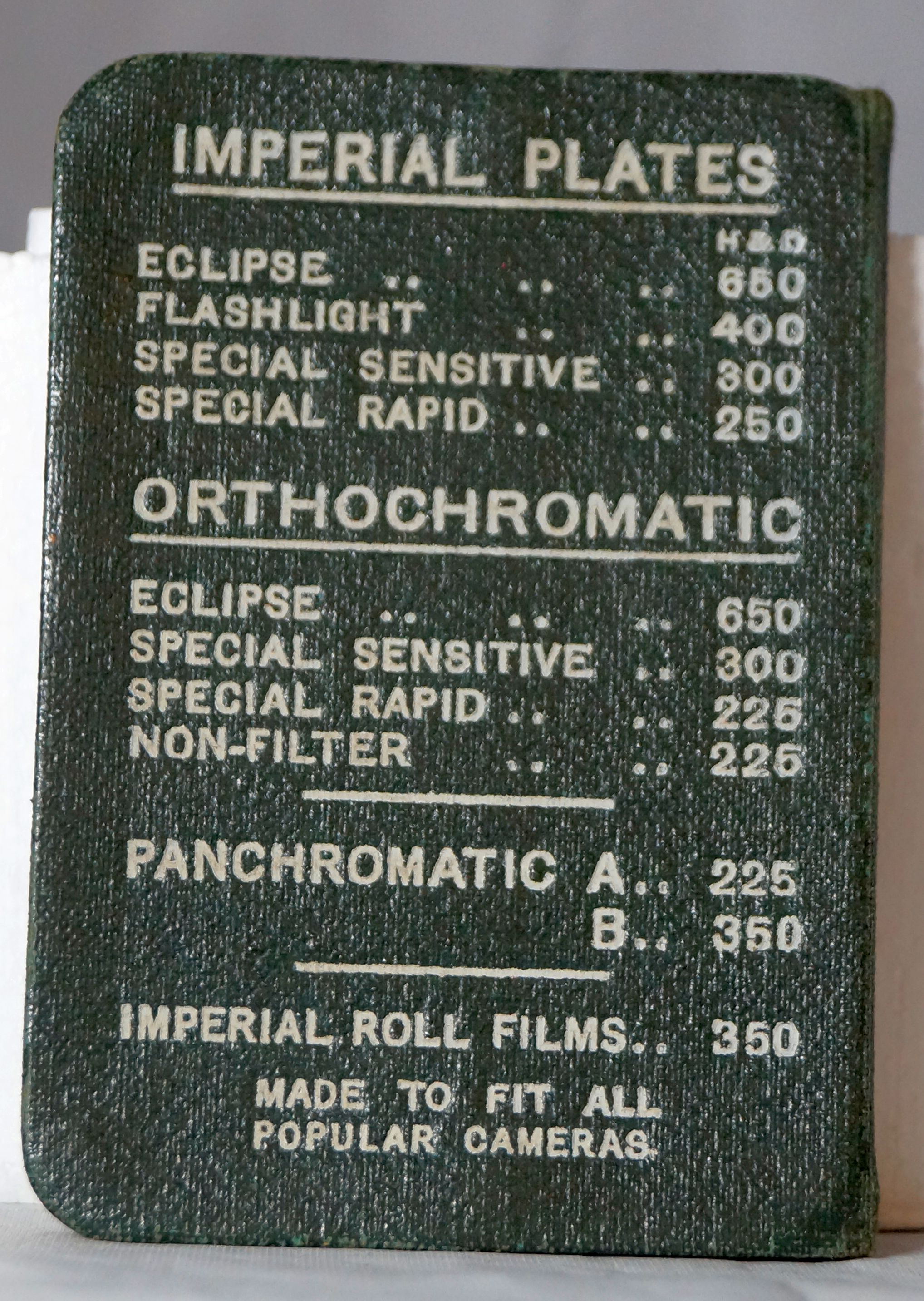 Hallo, ja, damals brauchte man als Knipser noch mehr als einfach nur nen Finger zum Auslösen :-), aber so lange waren die Belichtungszeiten gar nicht, ich hab mir das ganze nochmal zu Gemüte geführt, die Platten stehen nicht ohne Grund auf der Rückseite, die H&D Zahl dahinter wurde mit dem verschiebbaren streifen unter die gebrauchte Zeit geschoben, dann hatte man unten die Belichtungszeit. Also mal grob gerechnet, eine normale Platte mit 80-100 H&D Zeit hätte dann wenn das verfärben des Streifens 1 Sekunde gedauert hat bei Blende 8 eine Belichtungszeit von 1/5 Sekunden bei schwachem Licht. Und hier ist auch der Unterschied zwischen den Büchlein, während bei "dull light" die Belichtungszeit bei 1/25 anfängt beginnt sie bei bright light bei 1/500 Sekunden, wenn man sich die Rückseite anschaut erkennt man das sich die Filme ändern, und bei der einen sogar schon Rollfilm dabei ist, daher gehe ich davon aus das beide Büchlein zu verschiedenen Zeiten herausgegeben wurden, das dunkle wohl früher. So hatte, beim schon genannten Beispiel, ein Rollfilm mit einer H&D Zahl von 350 bei Blende 8 eine Belichtungszeit von 1/250, es war daher wohl extrem wichtig das richtige Büchlein zu haben, denn auch die H&D Zeiten der bei beiden vorkommenden Platten ändern sich. Also kann man an den Büchlein einen Verbesserung der Empfindlichkeit der Platten erkennen ( höhere H&D Zeit = empfindlicher)