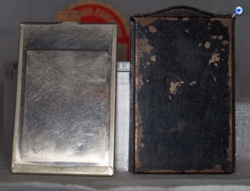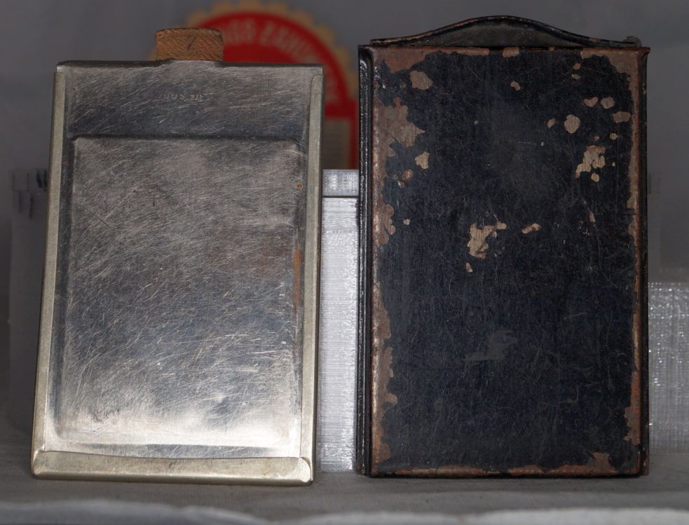 Hallo, ich habe kürzlich in der Bucht eine größere Menge verschiedener Plattenhalter, Rückwände für Planfilmpacks, Rollfimkasetten usw. Ich habe nicht viele Laufbodenkameras, daher war der Kauf mehr aus Interesse was es so gab, und ich bin echt begeistert, vermtlich werde ich das eine oder andere weitergeben, da ich keine Mengen an Kasetten brauche für die ich keine Kamera habe aber das sei erstmal dahingestellt, wenn interesse besteht kann ich aber gerne einige interesanntere Stücke hier auch mal zeigen..... wo war ich, ach ja, auf jeden Fall waren dabei zwei Plattenhalter die ich etrem klein fand, ich habe auch noch keine Kamera gesehen wofür sie passen würden, sie sind, den innenmaßen nach zu urteilen für platten im Format 4 x 5,5 cm gedacht, und offensichtlich für verschiedene Kameras gedacht die eine trägt eine Kyrillische aufschrift. , gab es wirklich solche Miniatur Plattenkameras, und waren die Häufiger? Sorry für die dumme Frage.