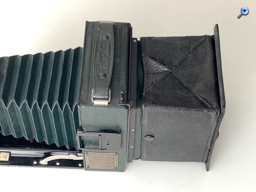 hier mal wieder ein interessantes Zubehörteil für Plattenkameras – das Kaloskop des fränkischen Lederherstellers Kalos.