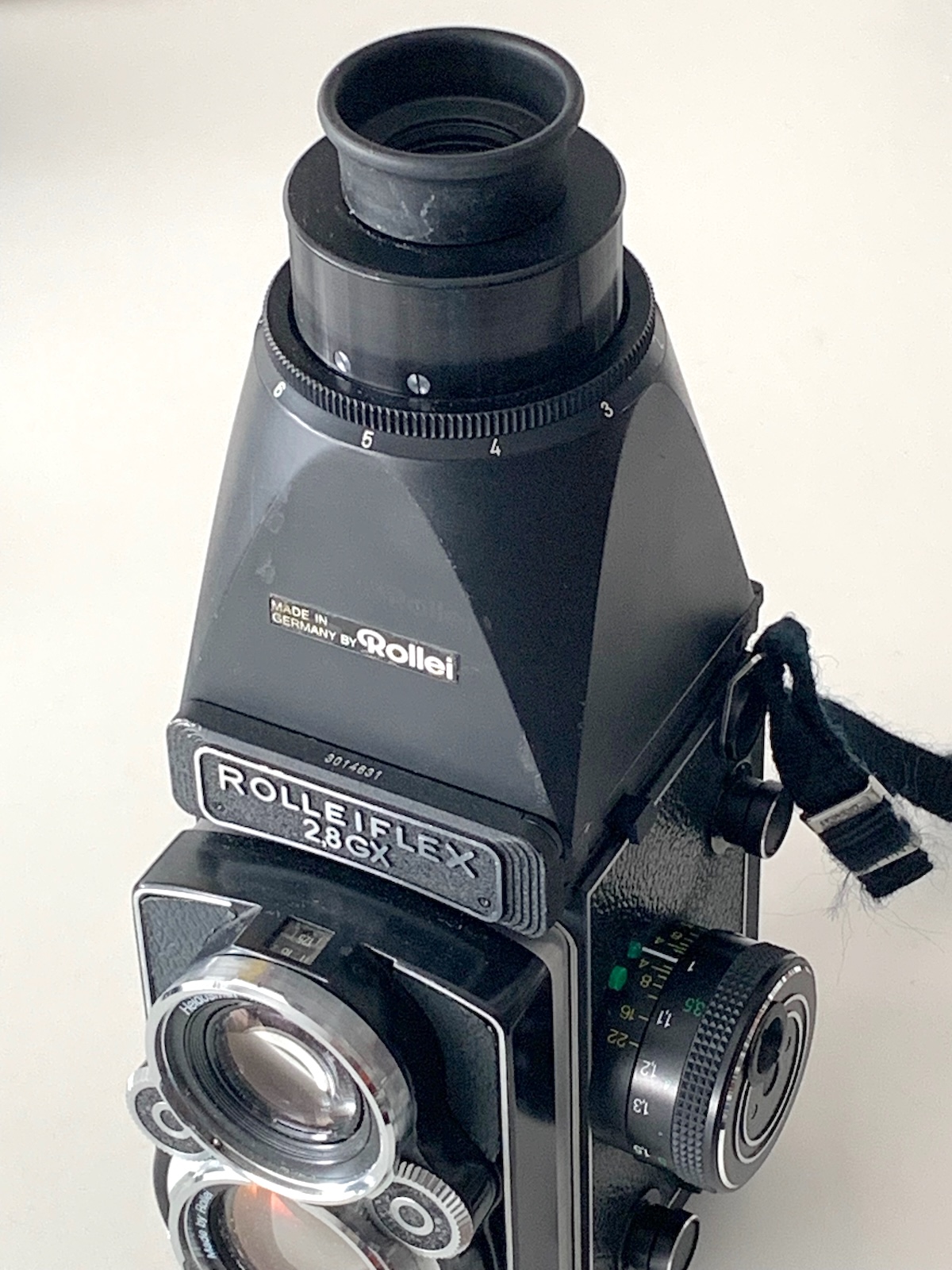 wie schon der Prismensucher (--> https://blende-und-zeit.sirutor-und-comp...&thread=156) kann an die Rolleiflex-Kameras mit Faltlichtschacht sowie an die Rolleicord Vb auch ein Lupensucher montiert werden, der eine 2,5fache Vergrößerung bietet und sich besonders für Aufnahmen vom Stativ empfiehlt. Fehlsichtigkeit kann durch Verstellen des Okulars ausgeglichen werden. Der Lupenlichtschacht wurde von der SL66 übernommen und für die Zweiäugigen mit einem eigenen Anschluss versehen. Er kam 1969 für 138 DM auf den Markt und blieb bis 1981 im Programm; zuletzt betrug der Preis 220 DM. – Zur Illustration habe ich ihn an eine 2,8 GX montiert.