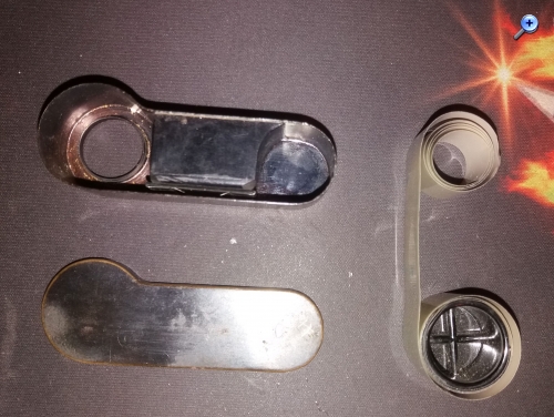 Hallo, ein Blick ins innere hat mich leider der Kamera kein Stück näher gebracht, allerdings ist nun klar das die Dinger zum einlegen in eine Kamera da wahren. Der unperforierte 16mm Film wird mit einem ende in die Spule eingelegt und dann in die Kassette einfädelt, und zwar gegenüber dem Loch, und zwar so das wirklich nur ein Bild belichtet wird. Wie man sieht ist der mittelteil vom Rest der Kassette abgetrennt so das der restliche Film nicht belichtet wird. Meiner Ansicht nach waren die Kassetten dazu gedacht Film vorzubereiten und schnell und ohne Schwierigkeiten zu wechseln. Wie gesagt bestehen die Teile aus Massivem Messing was einerseits für ein etwas höheres alter spricht, und auch für eine wertige Kamera, wobei die Kamera, denke ich, nicht viel größer war als die Kassetten. Denn alles zum Belichten, bis eben auf das Objektiv und eine Spule sind in der Kassette. Leider ist der einzige Aufdruck, bzw. die einzige erkennbare Kennzeichnung das C am einen Ende der Kassette. PS: Ich habe gerade mal die andere Kassette geöffnet, hier wurde perforierter Film eingelegt, aber wohl nicht aus notwendigkeit sondern weil gerade zur Hand. Ich habe es auch mal auseinandergenommen, die kleine Platte um das Loch ist nur aufgeschraubt, vielleicht halten die Schrauben auch die Bakelit Belichtungskammer. Hinter der Kammer befindet sich eine einfache Andruckplatte , also im Prinzip das ganze Innenleben einer Kamera.
