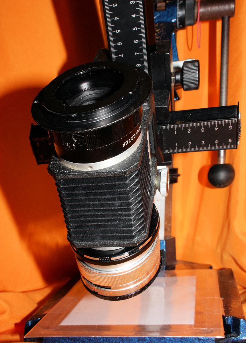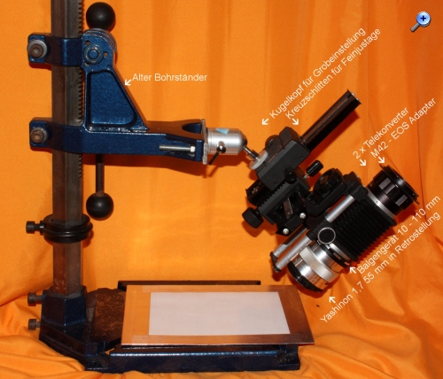 Ein alter Bohrständer, der seit Jahren unbenutzt im Keller vor sich dahinrostete wurde restauriert und als Basis für meinen Makro-Arbeitsplatz vergew...igt. Ein Kugelgelenk, Kreuz-Makroschlitten, Balgen, Objektiv, Retroadapter und EOS-Adapter in geeigneter Manier drangebaut, fertig: Mit dieser Kombi kann ich je nach Auszug und Verwendung des 2x Konverters eine Vergrößerung bis ca 14 : 1 (Objektbreite zu Sensorbreite) bzw. über 2000 px/mm erreichen!