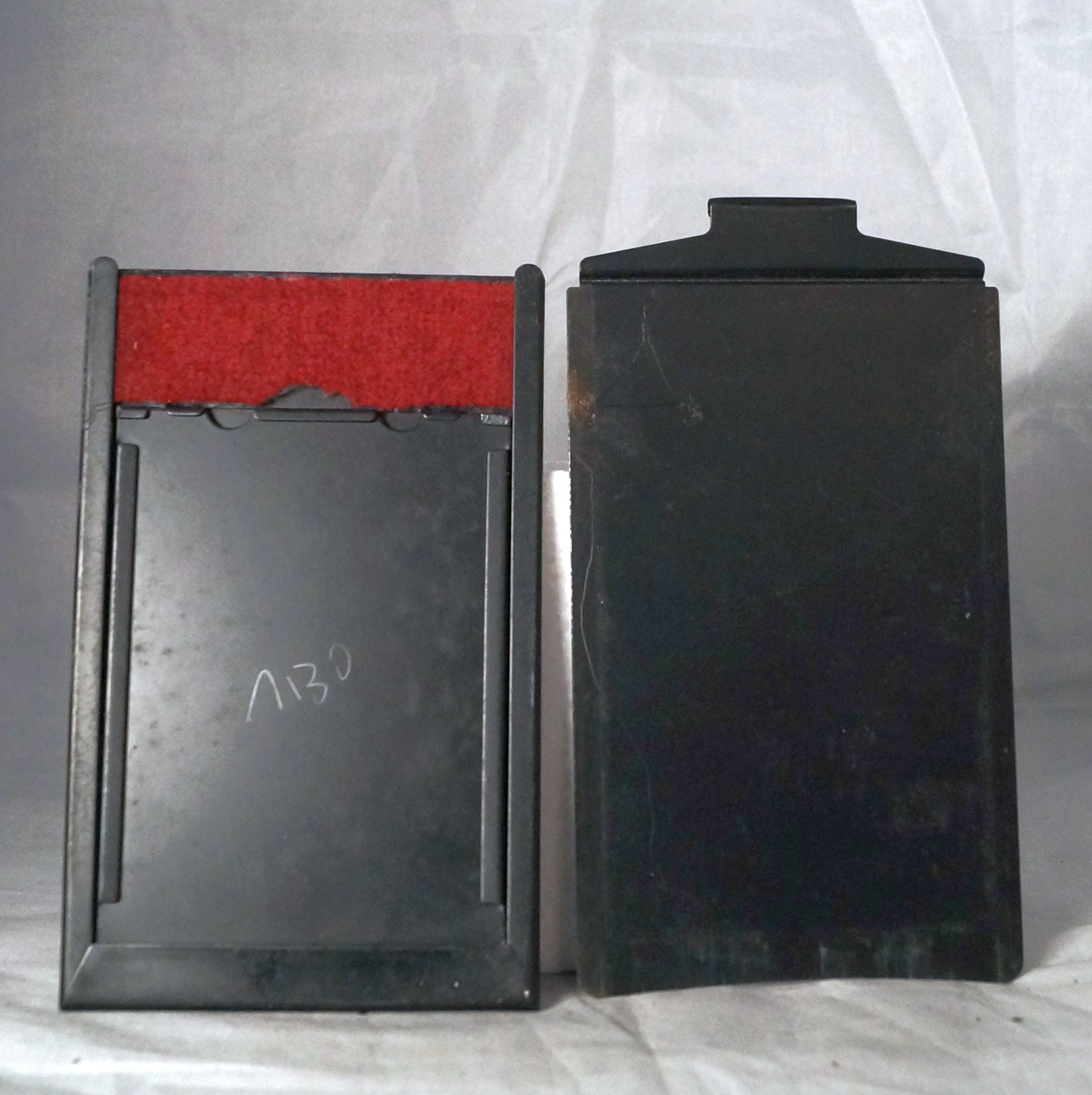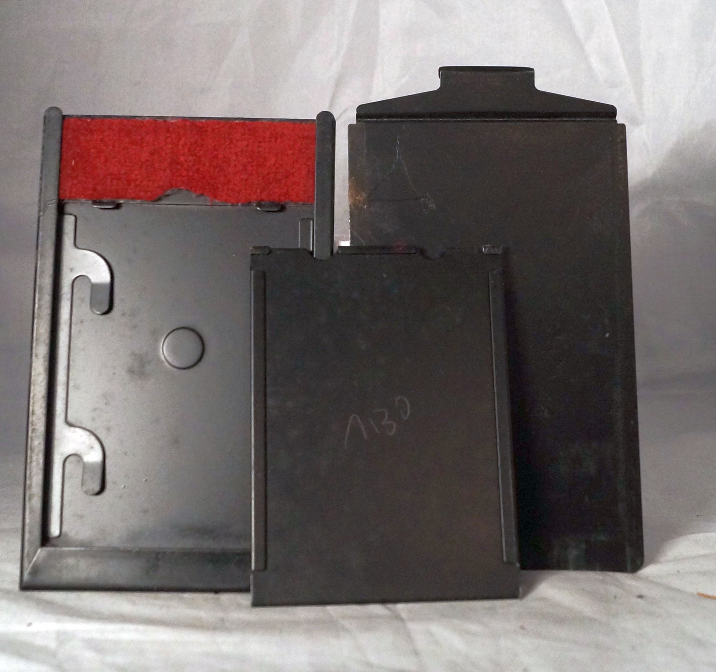 Ähnlich ist es bei den anderen Teilen, es handelt sich um einige Kassetten mit Planfilmhaltern, offensichtlich waren sie zum hinstecken in eine Kamera gedacht, denn sie haben keinen Falz zum Einschieben wie die Kassetten von Laufbodenkameras, ich gehe daher davon aus das sie für eine bestimmte Mittelformat Kamera gedacht waren.