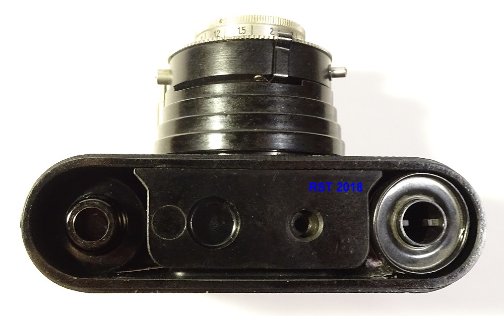 Auch die Filmtransportmechanik war recht rudimentär gestaltet und arbeitet (heute) unzuverlässig. Der Film läßt sich nicht gut komplett in den Schlitzbereich der Kamera einführen, er verhakt sich irgendwie an dem Filmzähler-Greifer. Könnte ein Fehler sein, da auch der "R"-Hebel sich nicht - wie erwartet - bedienen läßt.
