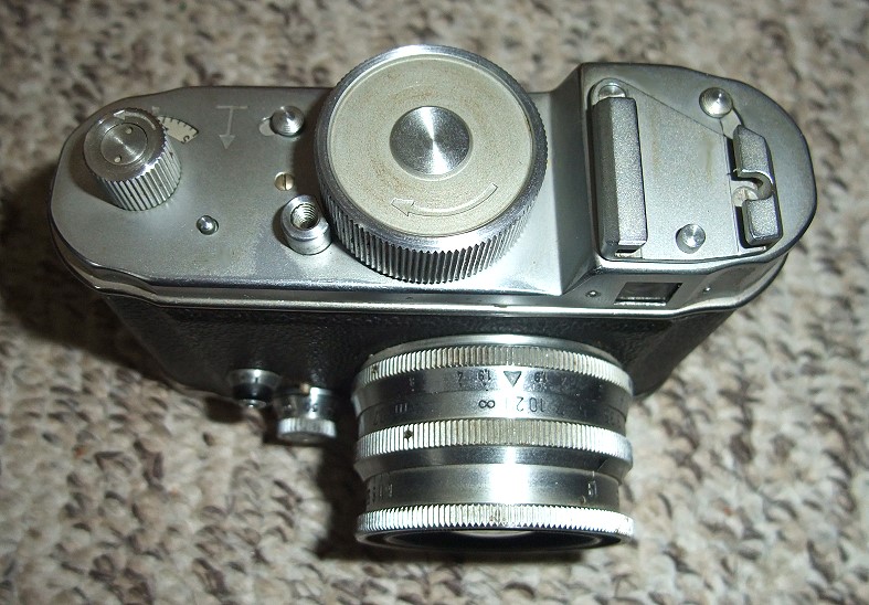 Filmtransport / Auslöser: Drehknopf für mechanischen Aufzugsmotor auf Oberseite für ca. 24 Aufnahmen. Auslöser direkt daneben, blockierbar.