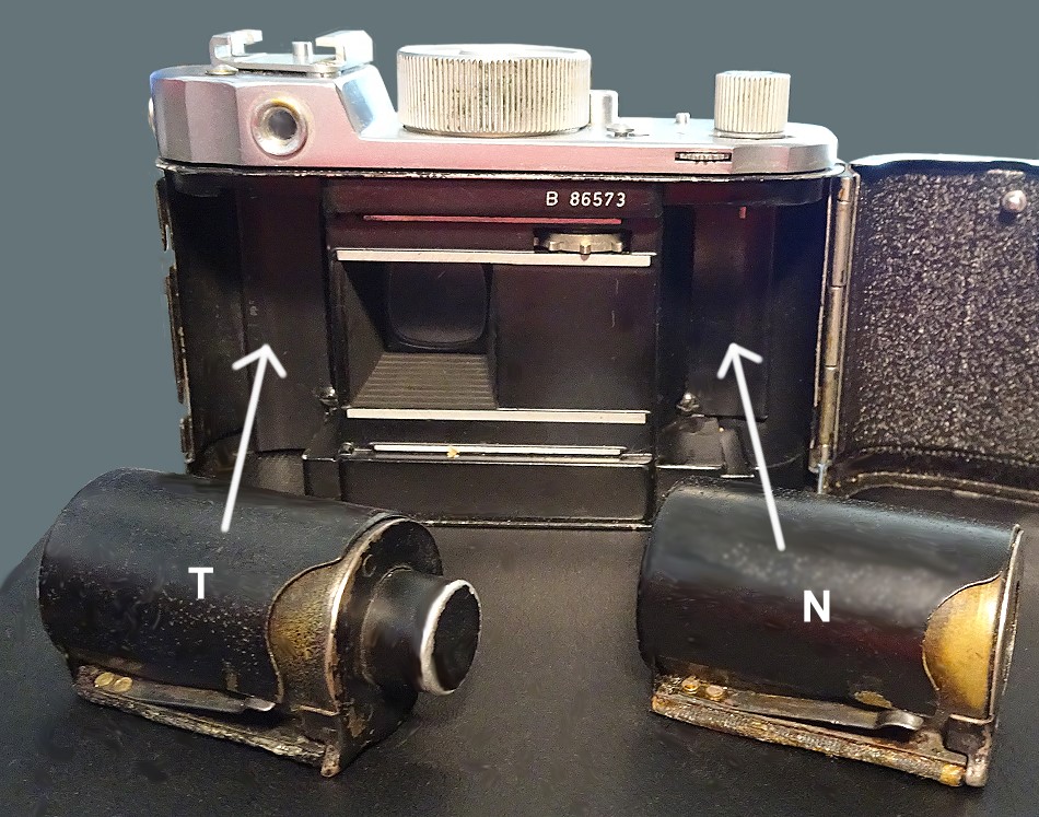 Sucher: 2 Durchsichtsucher, einer mit 90 Grad Winkel, umschaltbar. Kein Parallaxenausgleich.