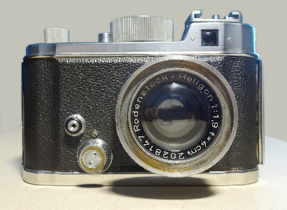 Objektiv: Wechselobjektiv mit Schraubgewinde. Lichtstarkes seltenes Rodenstock Heligon 1:1,9 f=4 cm. 0,6 Meter bis unendlich. Schärfentiefe-Tabelle. Das Heligon war wohl recht selten an der Kamera im Einsatz. es hat hier die Serien-Nr.: 2028147. Die Kamera wurde auch mit anderen Objektiven geliefert. Geeignet für Wechselobjektive unterschiedlicher Brennweiten. Das Gewinde passt zwar zu verschiedenen Filmkamera-Objektiven, ist aber optisch nicht verwendbar.