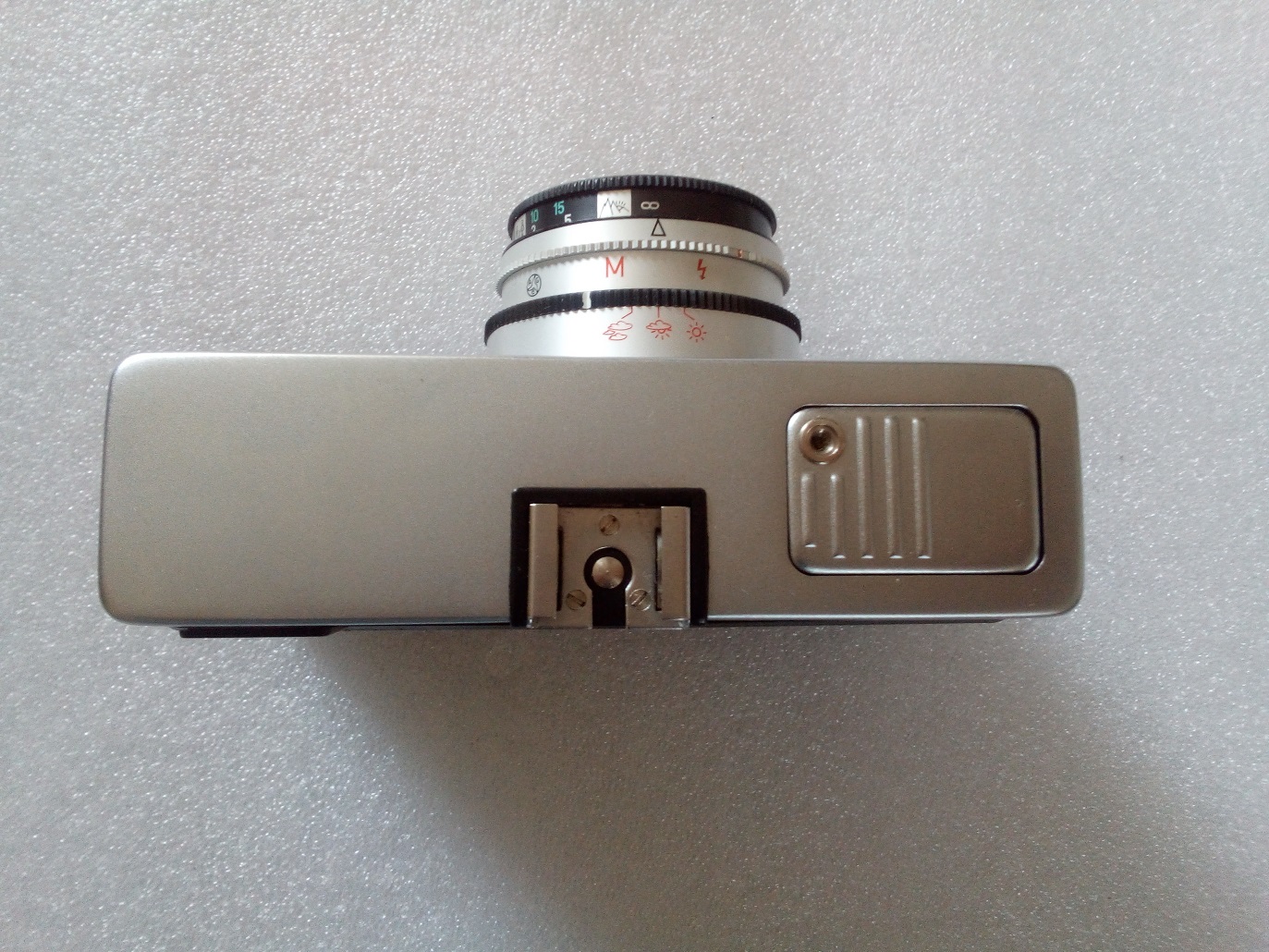 große Auslösertaste mit Drahtauslöseranschluß, Blitzschuh mit Mittenkontakt (im Blitzmodus 1/30 sec), Schnellspannhebel, Filmzählwerk (springt beim Öffnen der Rückwand automatisch auf "Pfeil"), Filmmerkscheibe, Stativgewinde, Rückwand mit Filmandruckplatte