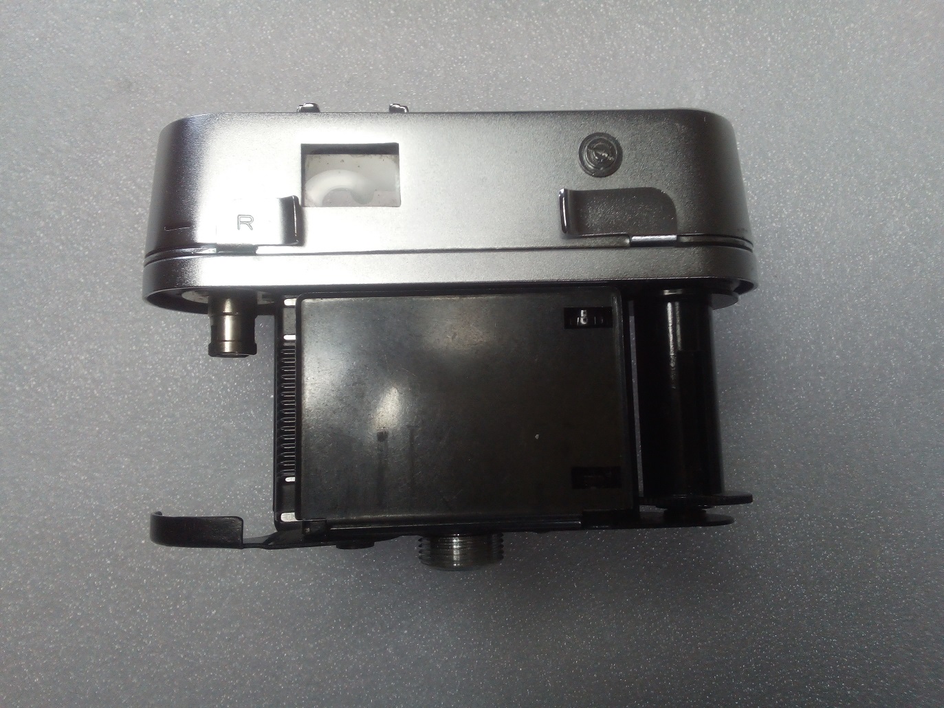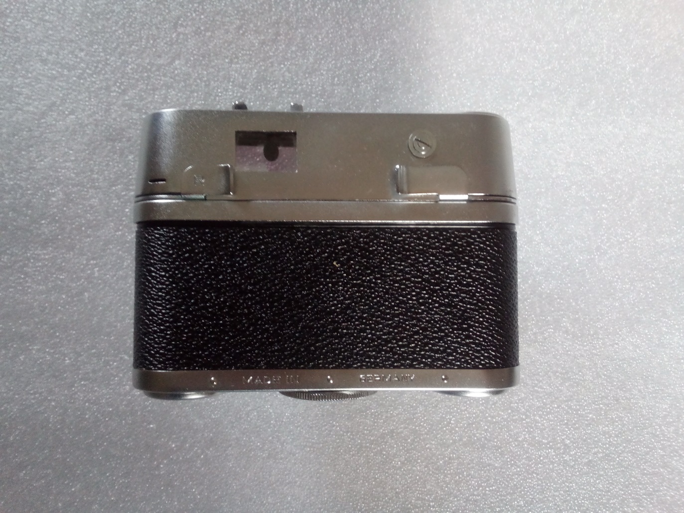 • Rückseite: Kontrollfenster für den Filmtransport, Rückspulhebel, Sucher mit Parallaxmarken und "Grünanzeige", Entsperrknopf für die Filmrückspulung, Schnellspannhebel (2 x spannen), abnehmbare Rückwand