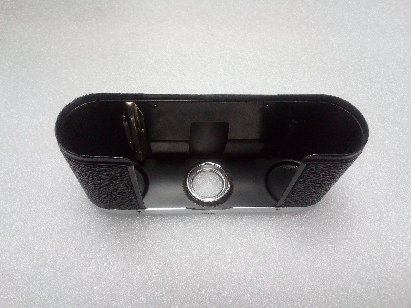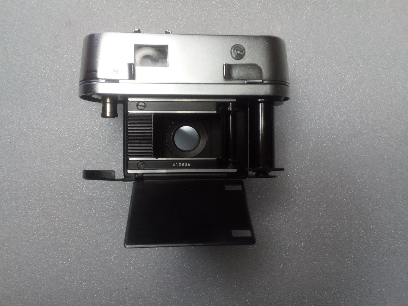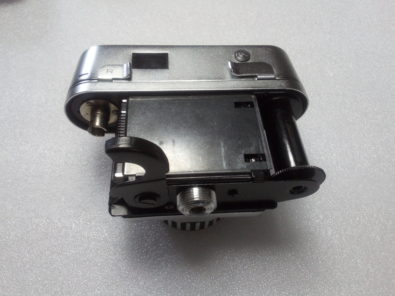 Interessant ist auch die Filmandruckplatte. Diese befindet sich nicht, wie bei den meisten Kameras, an der Rückwand sondern ist an der Kamera befestigt und muß beim Einlegen des Filmes umgeklappt werden.