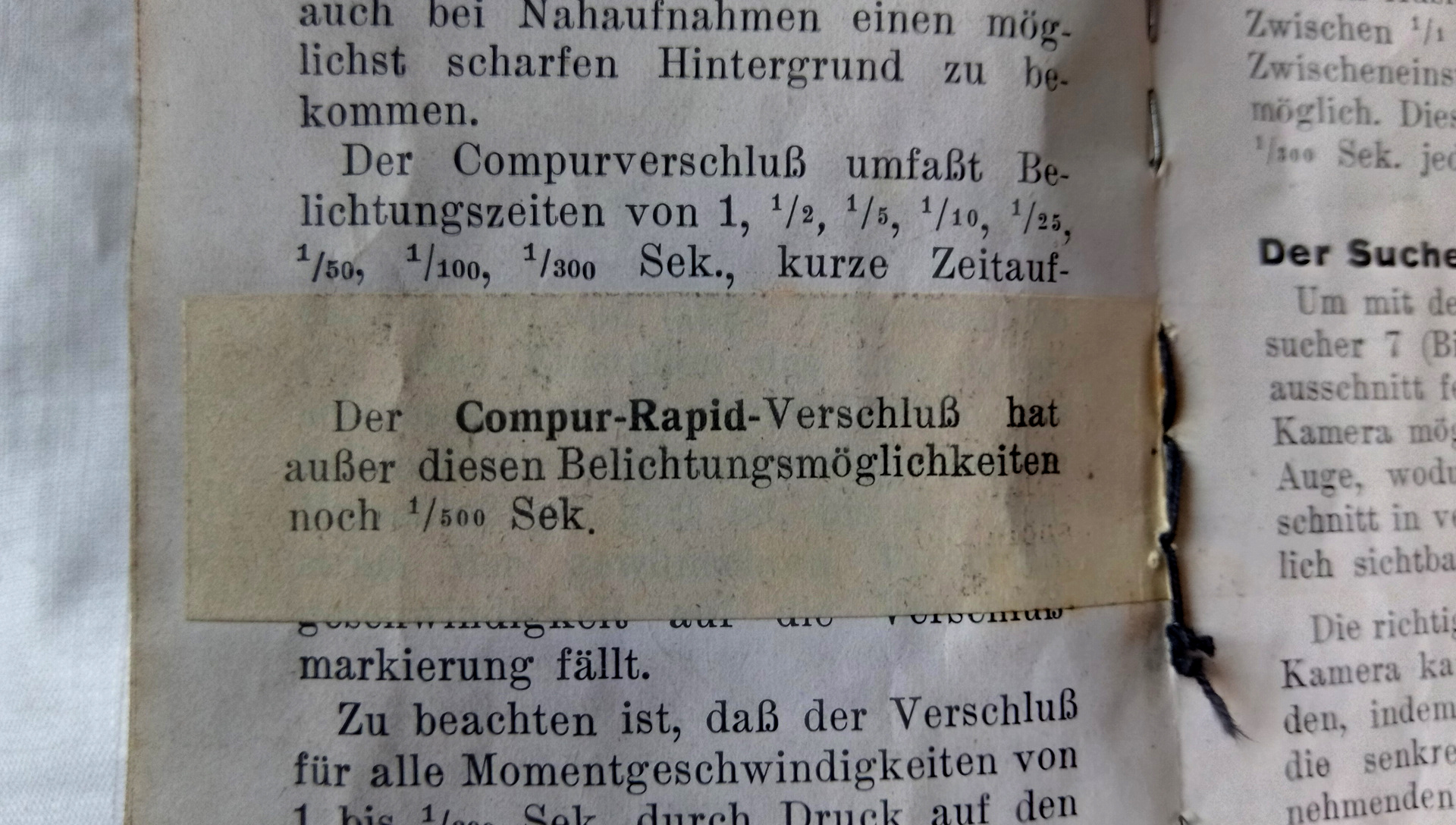 ich habe mir den Ring der hinteren Linse angeschaut, es sieht so aus als wäre da nichts gemacht worden. Ich mach morgen bei Tageslicht mal Bilder davon. Der Verschluss hat die Nummer 5002585. In der Bedienungsanleitung ist die Beschreibung des Compurverschlusses mit dem Hinweis auf den Compur Rapid Verschluss überklebt worden, allerdings professionell, also gedruckt, nicht händisch oder mit Schreibmaschine.
