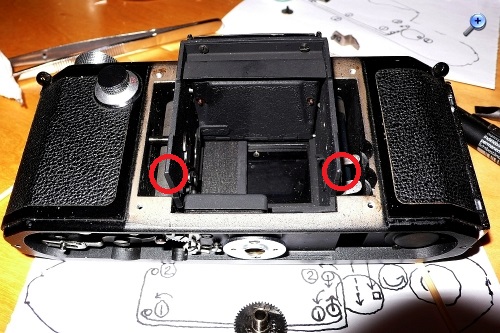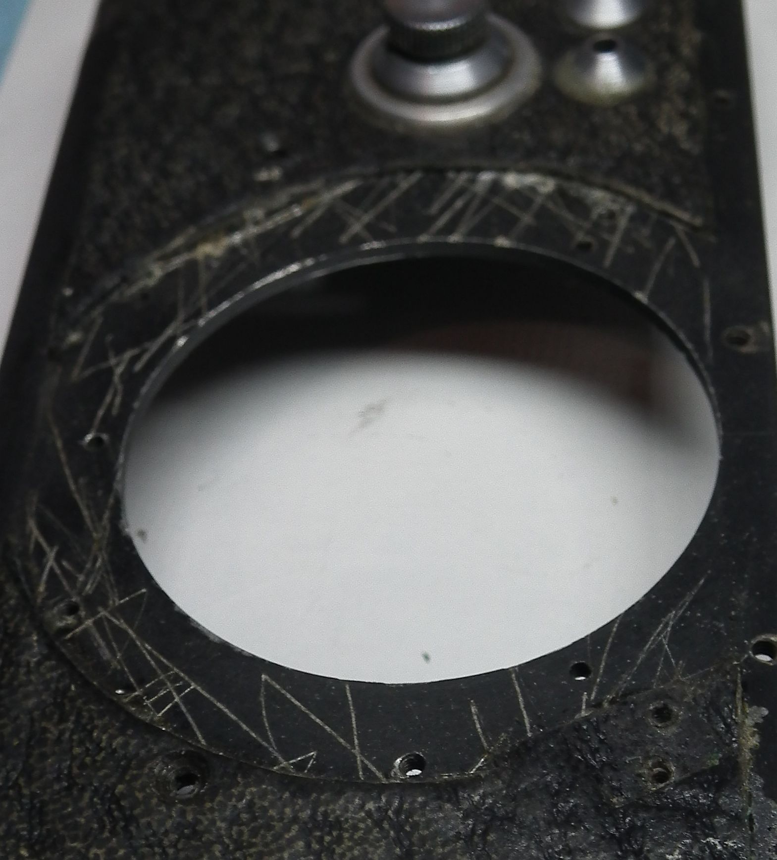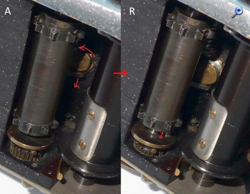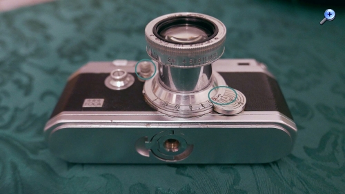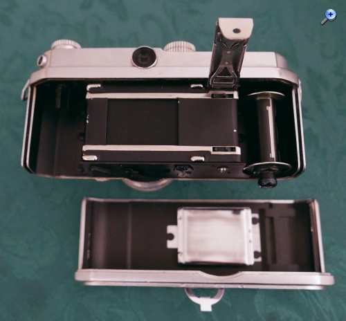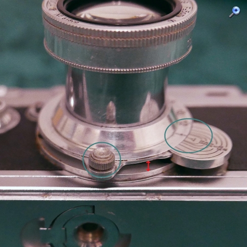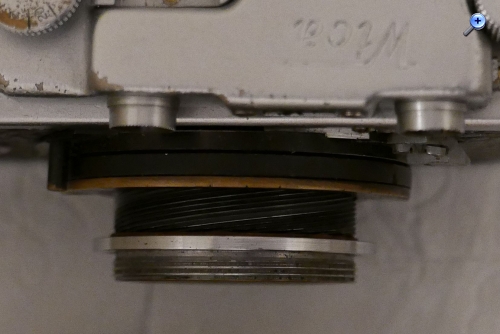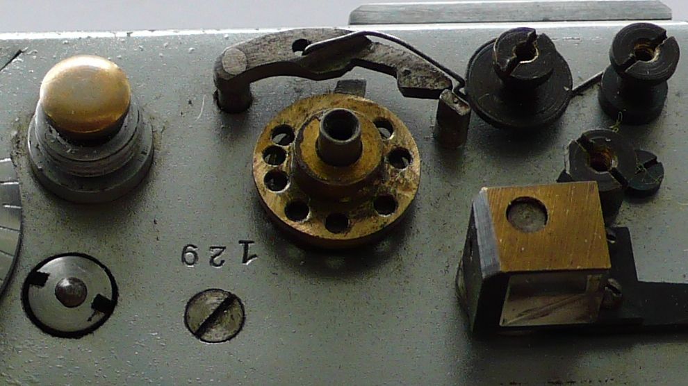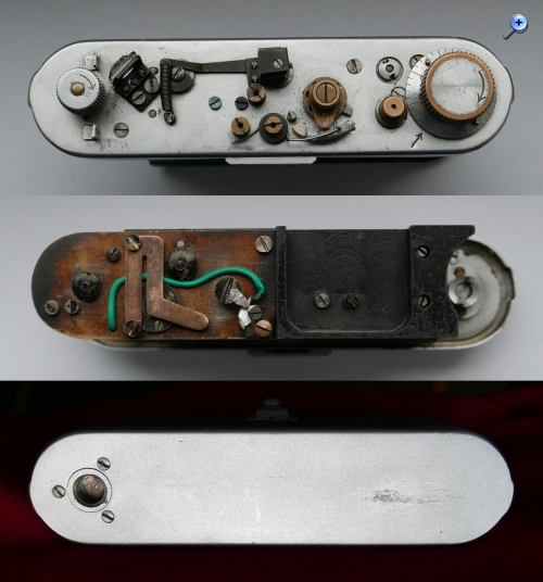 Der vordere Knopf, der dem Langzeiten-Einstellrad einer Leica gleicht und möglicherweise ein solches vortäuschen soll , ist nichts anderes als der A/R-Umschalter oder Rückspulknopf. Auf der Innenseite befindet sich eine kleine exzentrisch montierte Kupferscheibe (Siehe Bild), die durch das Verdrehen des A/R-Rades die Film-Transport-Walze entkoppelt.