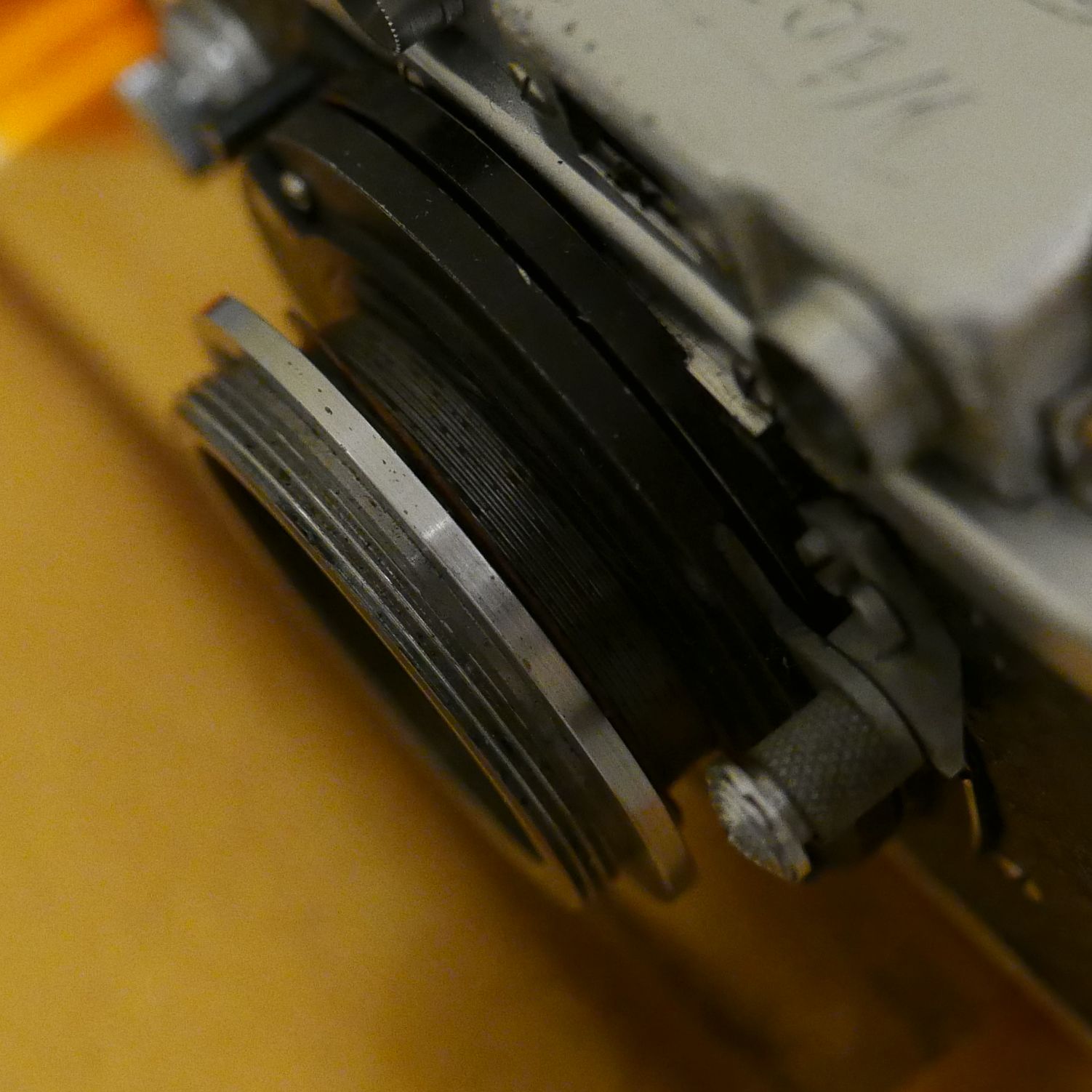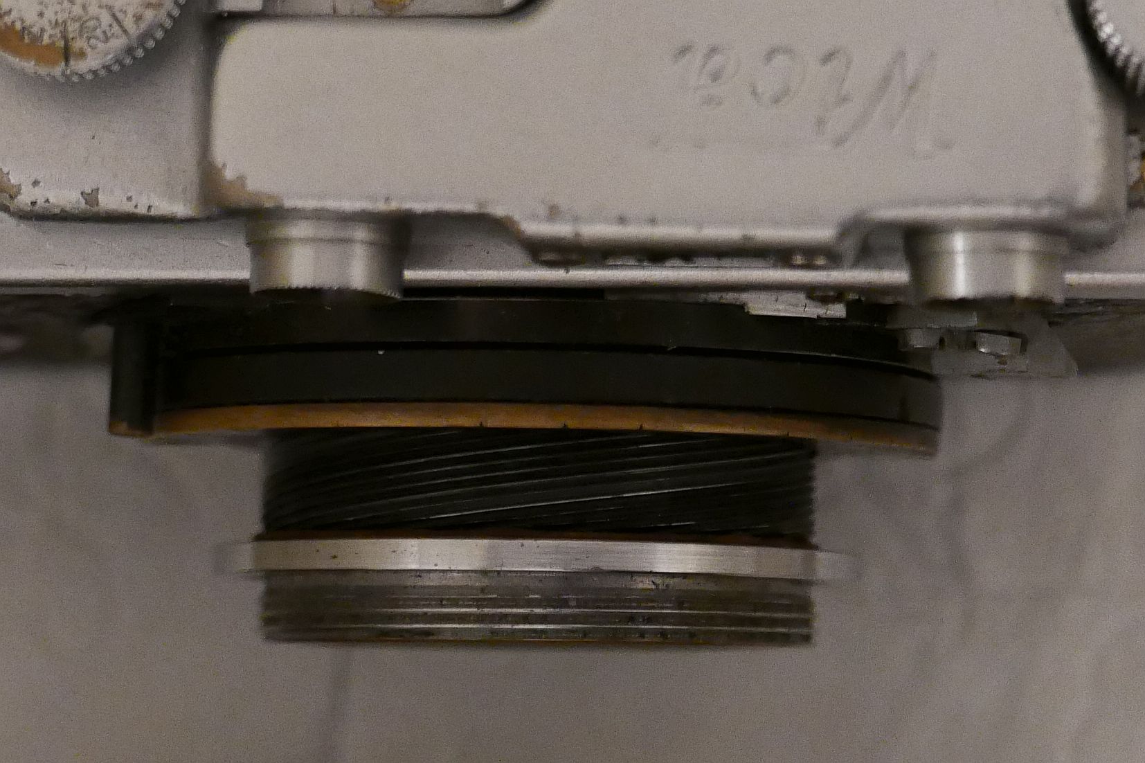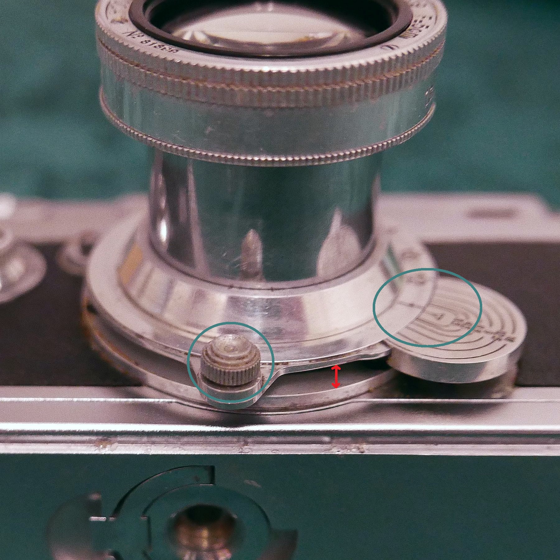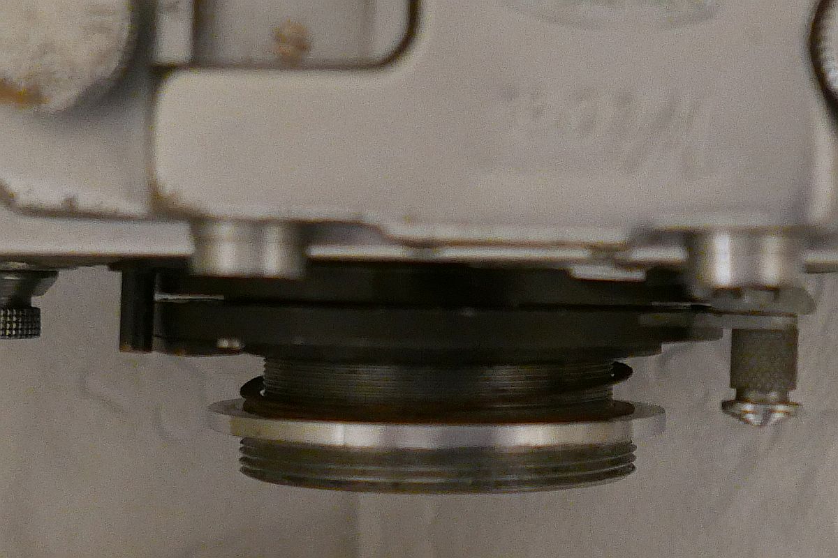 Das ist der Schneckengang (der meistens ausgeschlagen ist). Dadurch kam man sehr nahe an das Objekt heran. Als Zubehör gab es eine Einstellhilfe (Focusing Stage).