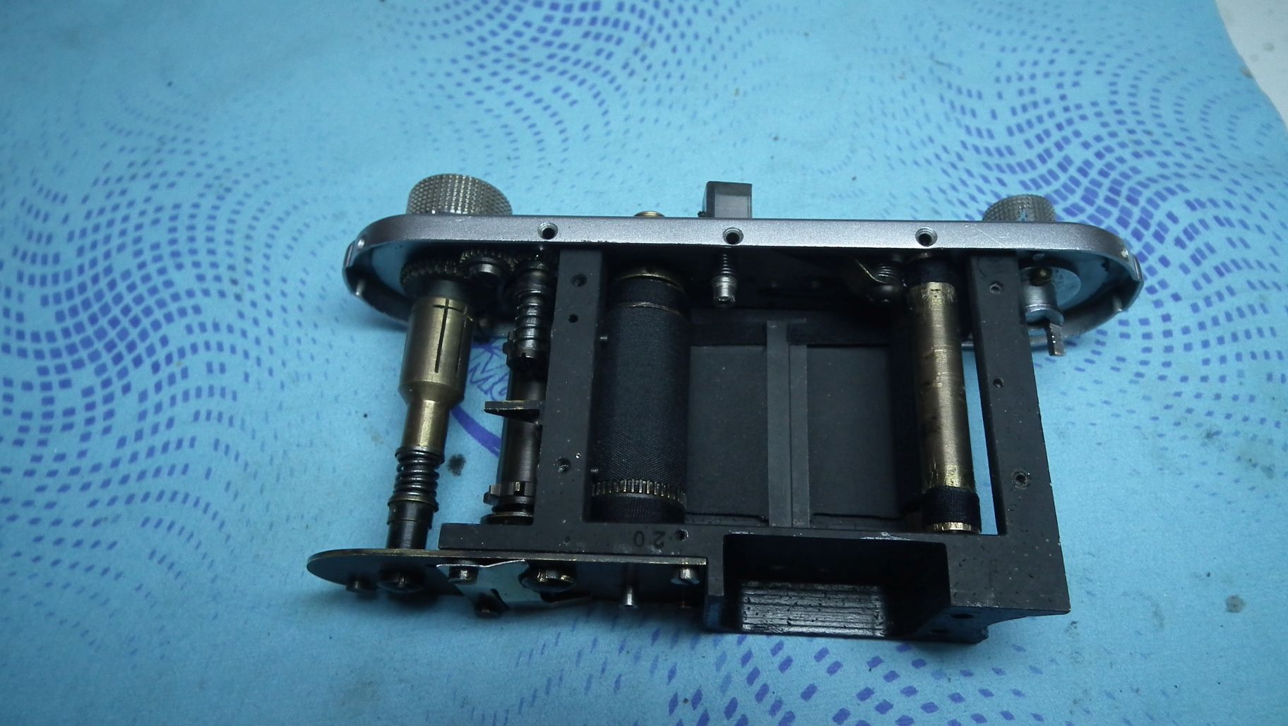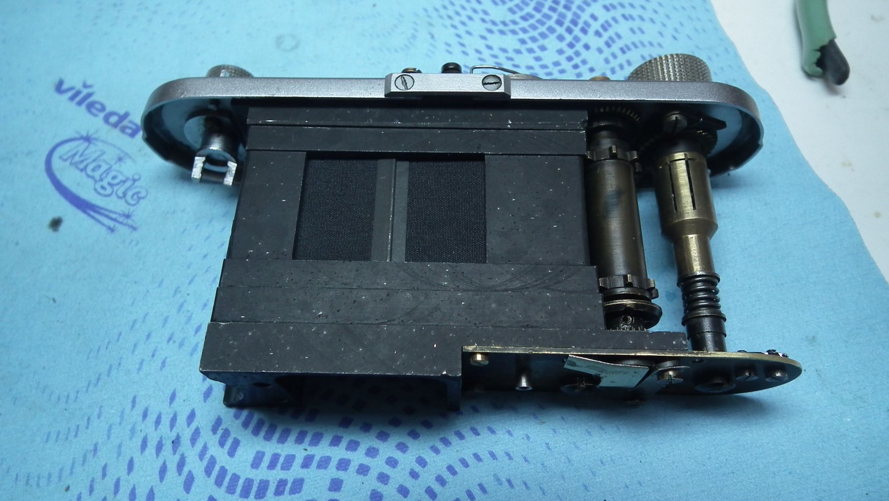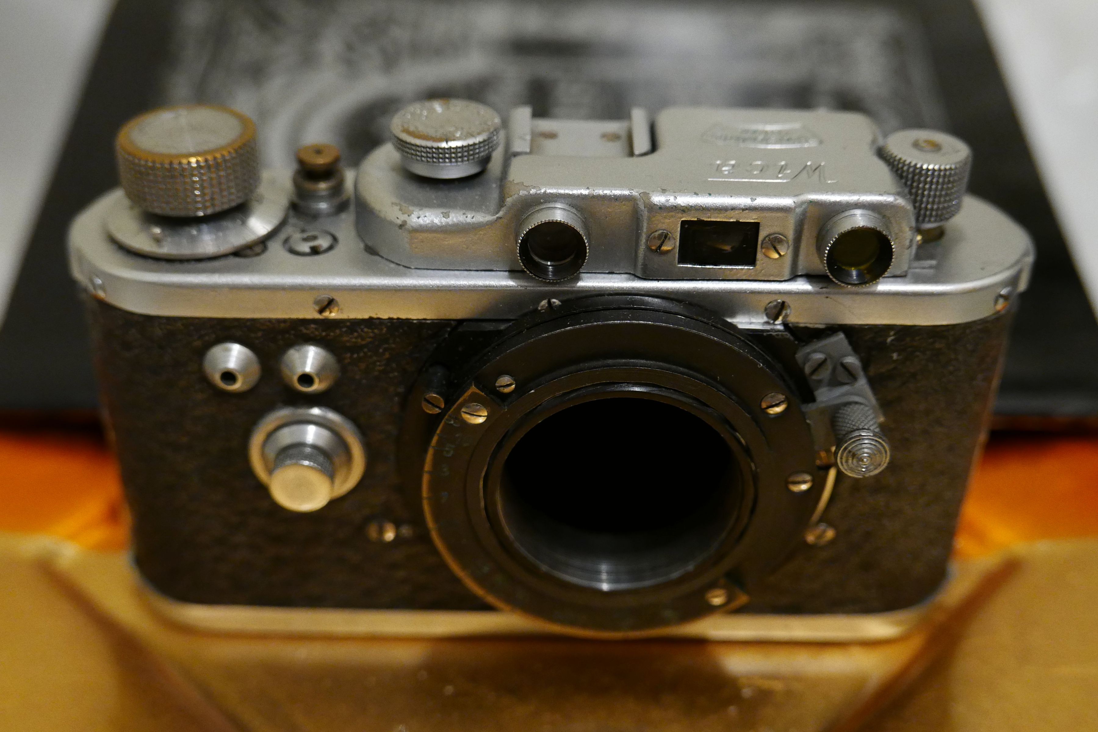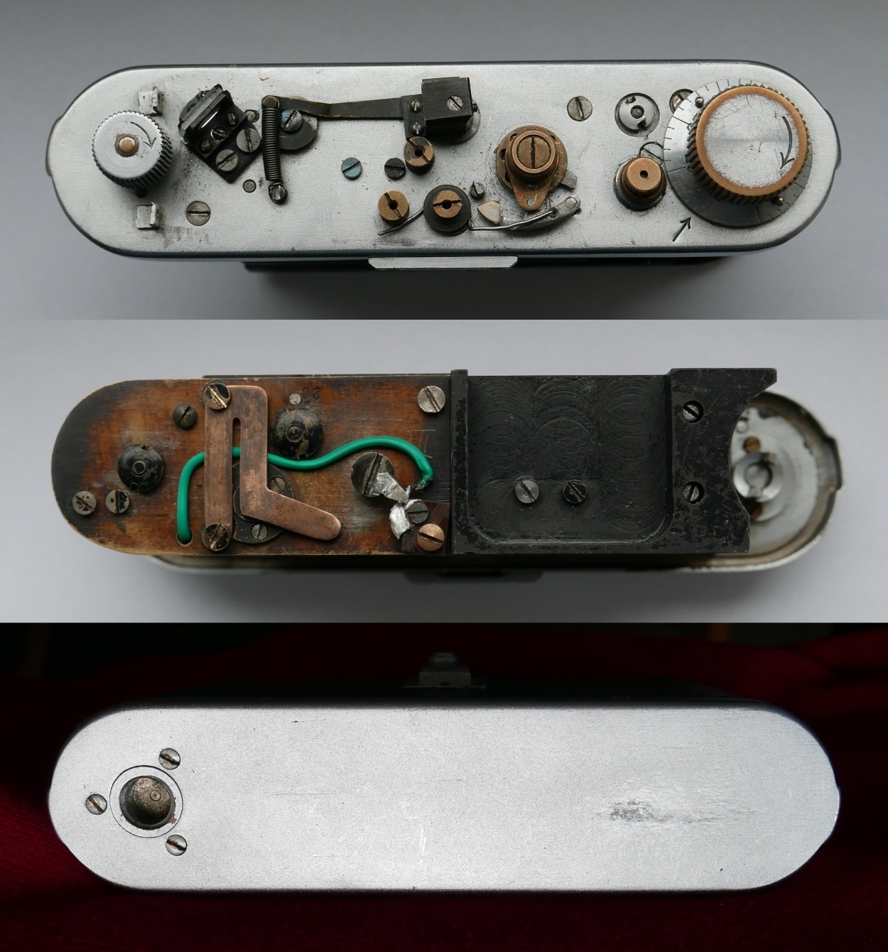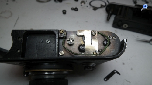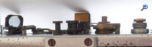 Nun zeige ich noch einige Bilder vom Innenleben. Ich bin für diese Kamera extra von Köln nach Wien geflogen, weil der ungarische Trödler (eBay) nicht verschicken und Bargeld sehen wollte. In Wien vertraute ich die nicht funktioniernde Kamera - die Flachfeder für die Sperrklinke war in zwei Teile zerbrochen und ein Teil davon wurde verkehrt aufmontiert! - einem mir bekannten Leica-Spezialisten mit ungeheurem Fachwissen und sehr viel Erfahrung an, weil ich mir die Reparatur des Halbspiegels für den Entfernungsmesser - der war, wie sich noch herausstellen sollte, ebenfalls in zwei Teile zerbrochen - nicht zutraute. Er hat das störrische Ding, das sich partout nicht einstellen lassen wollte (Verschlusszeiten) bis auf den schweren Metallblock zerlegt, alles gereinigt, eine russische Sperrklinke, eine provisorische Flachfeder und neue Tücher eingebaut...