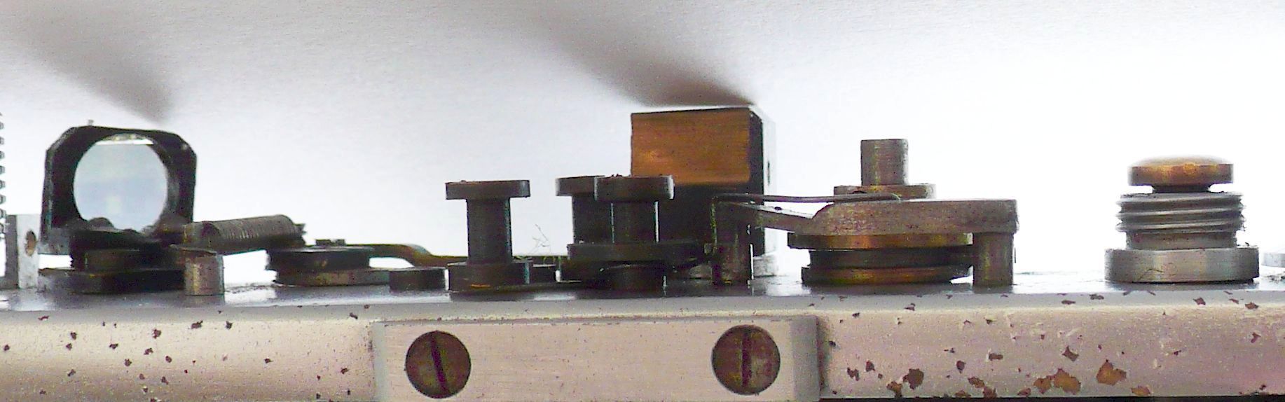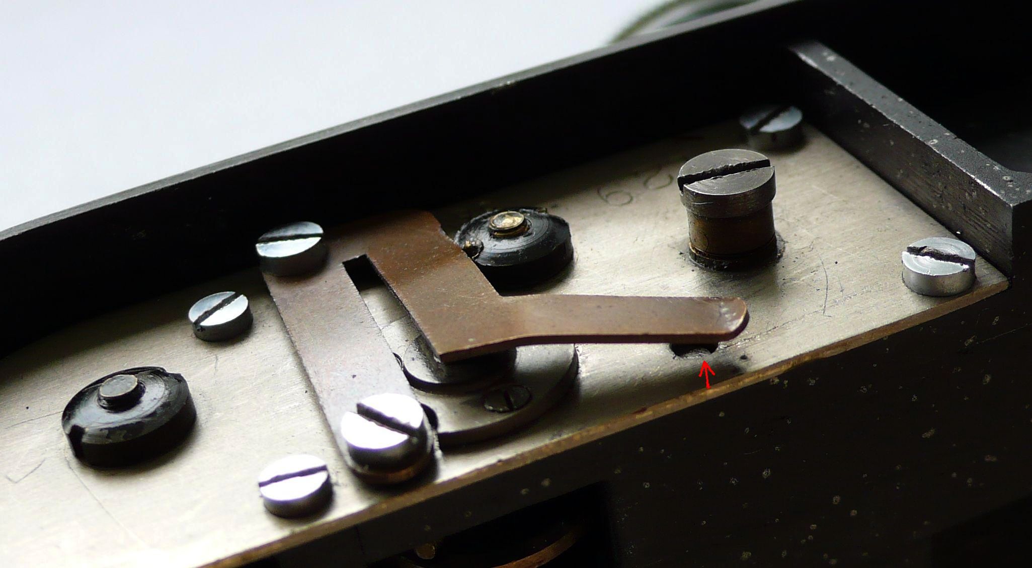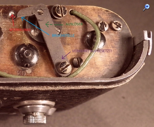 Das letzte Bild oben zeigt die intakte Flachfeder eines späteren (wegen diverser Mängel retournierten) Exemplars, die vom Auslöserstift nach unten gedrückt wird, und dadurch keinen Druck mehr auf die Sperrklinkenwelle ausübt, sodass diese von der oberen Feder nach unten durch das Loch hindurchgedrückt werden kann. Auf diese Weise wird der zweite Vorhang angehalten. Wenn die Sperrklinke nicht greift, laufen beide Tücher gleichzeitig (also ohne Schlitzbildung) ab. Zum Glück wusste ich (Foto), wie das Teil ursprünglich aussah und konnte es mithilfe einer Schmucksäge und einer Feile exakt nachbilden. Die helle kupferfarbene Bronze wurde mit HAuCl4 behandelt (das man erhält, wenn man Gold in Königswasser auflöst). Auf diese Weise wurde das Teil passend patiniert. Alles Handarbeit.