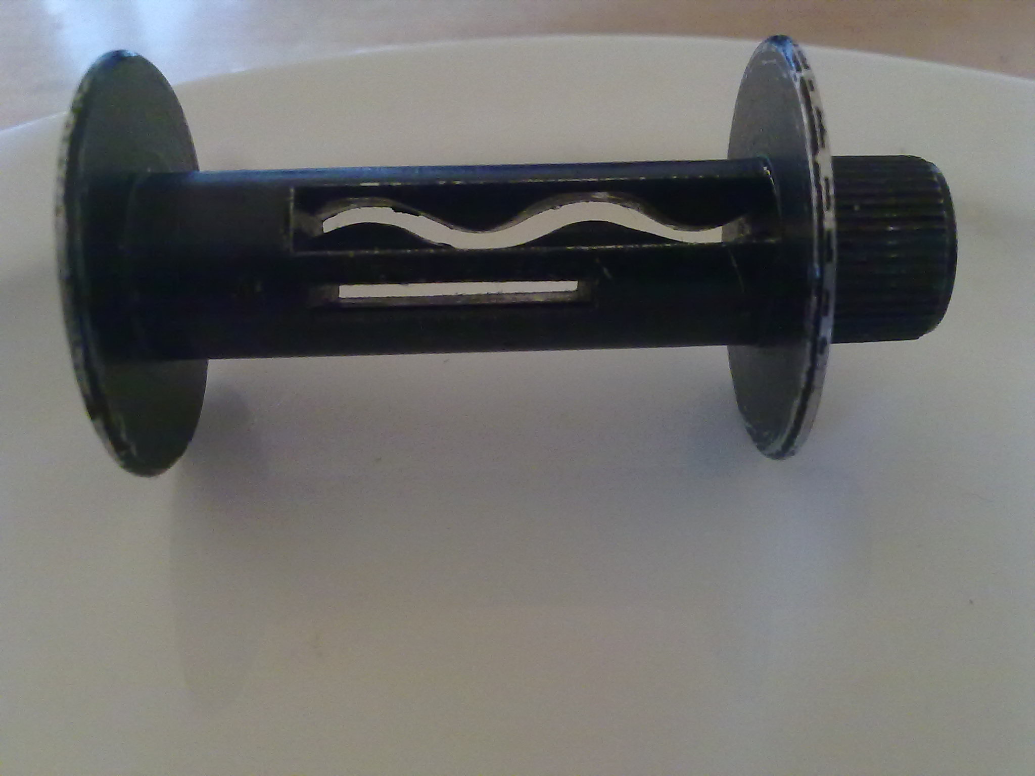 In diesen Patronen waren natürlich auch Spulen, brauchbare Bilder habe ich da leider nicht. Aber hier ein Foto von meiner Spule. Es ist eine Contaxspule (Aufdruck am Rändelrad). Scheinbar sehr selten und etwa um 1936. Zwei Schlitze sind zu sehen, eine "Welle" und einer mittig. Scheinbar um zwei Filmtypen bedienen zu können. Heutige Anschnitte des Film gehen durch die "Welle", der mittige Schlitz ist relativ unbrauchbar. Dieser Wellenschlitz hält den Filmanschnitt übrigens tatsächlich etwas fest, vielmehr als der spätere gerade Schlitz in den Contaxaufwickelspulen.