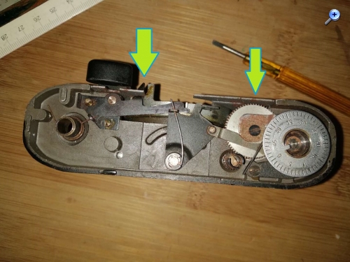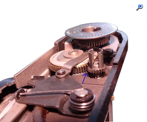 Nochmal aus Sicht von Oben. Ich drücke, da der Verschluss entfernt ist, zuerst die Sperre weg. Die Walze habe ich wieder nach links gedreht bis zum Widerstand. Beim Spannen bewegt sich nun das auf dem Foto rechts markierte Zahnrad, die darauf befindliche "Unterlegscheibe", der Rewinding knob (5) und der Filmzähler. Beim 2. mal bewegen sich nur noch Filmzühler und Unterlegscheibe.