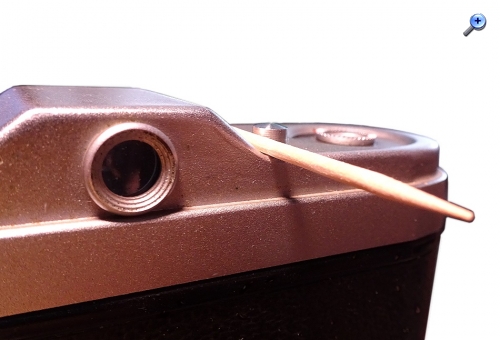 Wenn man den Knopf eindrückt get das Zahnrad auf seiner Achse mit nach unten und löst sich damit von dem verbundenem Zahnrad. Es kann sein, dass sich Teile der Mechanik nach unten zum Filmtransportrad an der Filmführung verklemmt hat. Die Drückhubstrecke ist ca. 2,5 mm. Der Knopf muss gedrückt gehalten werden, während man zurückspult.