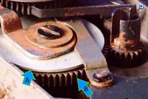 Es ist ja immer noch so, dass nur, wenn ich die Transporttrommel zum Widerstand gedreht habe, sie 1 bis 2 mal mitgenommen wird. Da dreht sich silberne Unterlegscheibe (Pfeil A) auf dem Zahnrad (B). Die nächsten male drehen sich ber nur silberne Unterlegscheibe (A) und die Filmzählscheibe. Das Zahnrad (B) sowie das sich unter dem Rückspulerlaubnisknopf befindliche Zahnrad somit nicht.