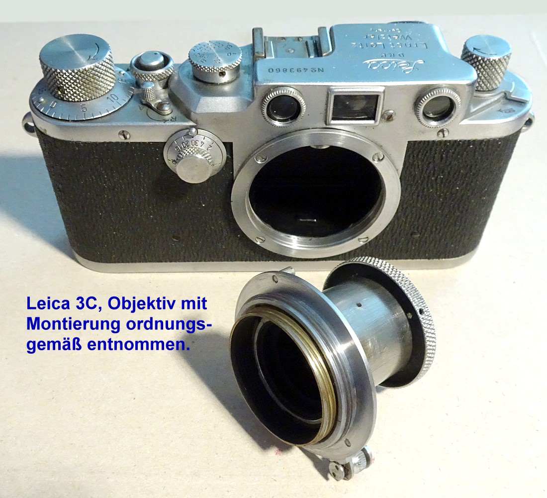 ich wieder eine email-Frage zum Objektiv (oder besser zum Wechseln des Objektivs) der Leica 3C bekommen. Da hat Jemand die Leica von seinem Onkel geerbt. Er wollte damit auch mal fotografieren. Er hatte irgendwo gehört, dass die Kamera ein Wechselobjektiv hat. Deshalb versuchte er das Objektiv abzunehmen. Ihm ist das so nicht gelungen (siehe weiter oben im Thread wird der Objektivwechsel angesprochen). Er hat die Anschlagschraube gelöst und dann das Objektiv vom Montierungshinterteil gelöst. Nun bemerkte er die Fehleinschätzung, schraubte das Objektiv wieder in die Montierung und wunderte sich, dass Nahanschlag und Unendlichanschlag nicht mehr stimmte.