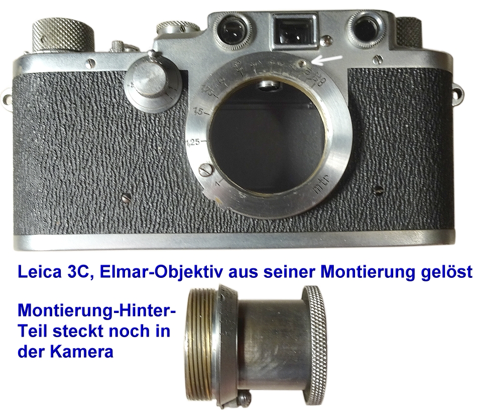 Ich habe das mal versucht nach zu empfinden und habe mein Elmar auch so heraus genommen und siehe: Tatsächlich kann man das Objektiv falsch wieder in das Montierungsteil hinein-schrauben. Es scheint zwei Einschraubstartpunkte zu geben.