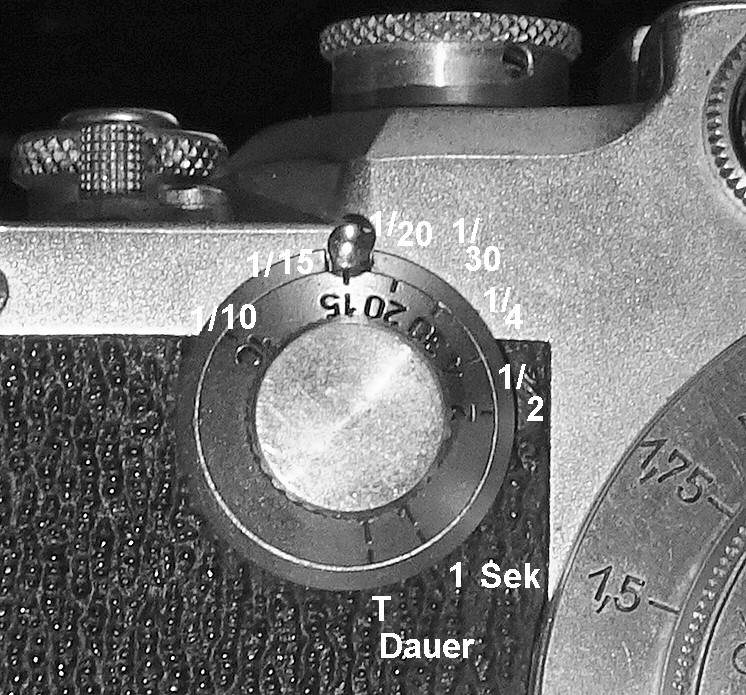 die gezeigte Kamera ist eine sogenannte IIIc Sharkskin (Material ist wie üblich Vulkanit, eine organische Schwefelverbindung). Dass die Langzeitenreihe unlogisch erscheint, liegt an einer technischen Besonderheit, die es vor der Leica c nicht gab. Das Hemmwerk bietet zwei Einstellungen, die über einen Hebel zwischen Langzeiteneinstellrad und Hemmwerk realisiert werden: a) Kürzere Zeiten ohne Anker b) Längere Zeiten mit Zuschaltung des Ankers