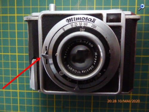 Der Auslöser-Knopf geht auf einen Hebel Aussen am Objektiv (Links) und drückt diesen herunter. Diser Hebel wird erst freigegeben, wenn der Film mit einem Zahnrädchen weitergedreht wird. Das Verschluss-Hebelchen lösst sich von Hand herunterdrücken. Bild mit Pfeil