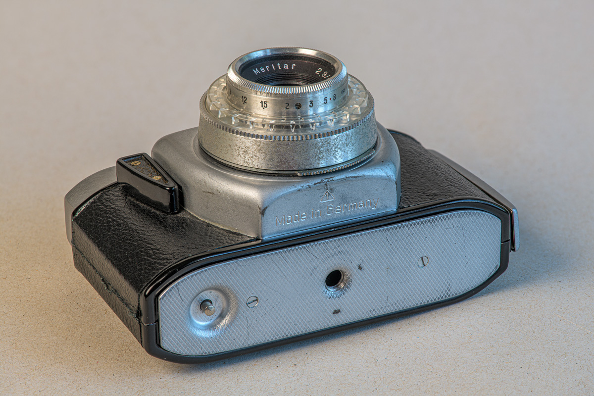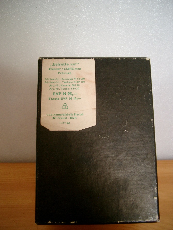 zufällig habe ich gerade gesehen, dass sich meine Beirette vsn etwas von dem hier schon vorgestellten Exemplar unterscheidet. Da wäre zuerst der Schnellspannhebel zu nennen der doch ein wenig anders aussieht. Auch werden Zeiten und Blenden bei dieser Version des PRIOMAT Verschlusses auf andere Art eingestellt. Vom Erscheinungsbild ähnelt die Kamera der Beroquick. Die beiliegende Bedienungsanleitung ist laut Aufdruck aus dem Jahre 1978. Auf dem Kameraboden ist das Gütezeichen "1" eingestanzt. Der Karton hat noch den originalen Preisaufkleber.