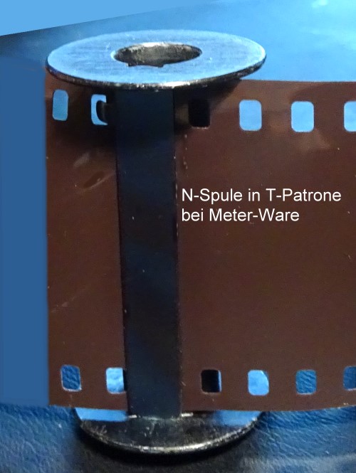 Die Patrone-N- Spule kann leicht und wieder lösbar den Film aufnehmen. Also: Ein N-Spulenkern wird in der T-Patrone genommen, aber auch in der N-Patrone muss sich eine N-Spule befinden.